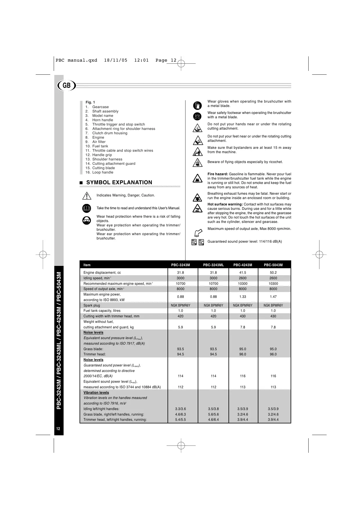 Wear safety footwear when operating the brushcutter with a metal blade. Do not put your hands near or under the rotating cutting attachment. Do not put your feet near or under the rotating cutting attachment. Make sure that bystanders are at least 15 m away from the machine. Beware of flying objects especially by ricochet. Fire hazard: Gasoline is flammable. Never pour fuel in the trimmer/brushcutter fuel tank while the engine is running or still hot. Do not smoke and keep the fuel away from any sources of heat. SYMBOL EXPLANATION Breathing exhaust fumes may be fatal. Never start or run the engine inside an enclosed room or building. Indicates Warning, Danger, Caution. Take the time to read and understand this User's Manual. Wear head protection where there is a risk of falling objects. Wear eye protection when operating the trimmer/ brushcutter. Wear ear protection when operating the trimmer/ brushcutter. Hot surface warning: Contact with hot surfaces may cause serious burns. During use and for a little while after stopping the engine, the engine and the gearcase are very hot. Do not touch the hot surfaces of the unit such as the cylinder, silencer and gearcase. Maximum speed of output axle, Max 8000 rpm/min. Guaranteed sound power level: 114/116 dB(A) PBC-3243M / PBC-3243ML / PBC-4243M / PBC-5043M Item