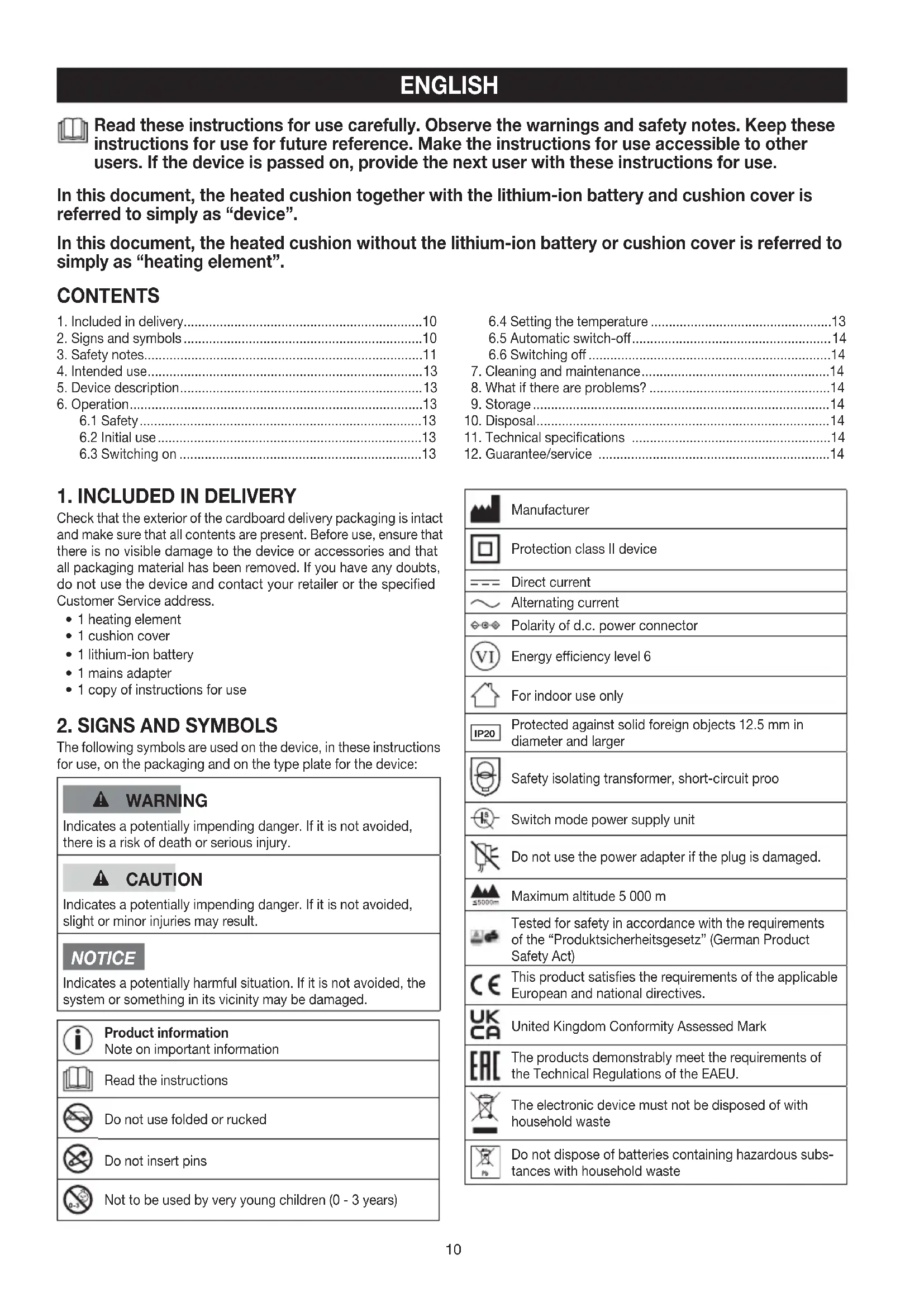 The following symbols are used on the device, in these instructions for use, on the packaging and on the type plate for the device: WARNING Indicates a potentially impending danger. If it is not avoided, there is a risk of death or serious injury. CAUTION Indicates a potentially impending danger. If it is not avoided, slight or minor injuries may result. NOTICE Indicates a potentially harmful situation. If it is not avoided, the system or something in its vicinity may be damaged. Product information Note on important information Read the instructions Do not use folded or rucked Do not insert pins Not to be used by very young children (0 - 3 years) Manufacturer Protection class II device Direct current Alternating current Polarity of d.c. power connector Energy eciency level 6 For indoor use only IP20 Protected against solid foreign objects 12.5 mm in diameter and larger Safety isolating transformer, short-circuit proo Switch mode power supply unit Do not use the power adapter if the plug is damaged. Maximum altitude 5 000 m Tested for safety in accordance with the requirements of the “Produktsicherheitsgesetz” (German Product Safety Act) This product satisfies the requirements of the applicable European and national directives. United Kingdom Conformity Assessed Mark The products demonstrably meet the requirements of the Technical Regulations of the EAEU. The electronic device must not be disposed of with household waste Do not dispose of batteries containing hazardous subs- tances with household waste CONTENTS Read these instructions for use carefully. Observe the warnings and safety notes. Keep these instructions for use for future reference. Make the instructions for use accessible to other users. If the device is passed on, provide the next user with these instructions for use. In this document, the heated cushion together with the lithium-ion battery and cushion cover is referred to simply as “device”. In this document, the heated cushion without the lithium-ion battery or cushion cover is referred to simply as “heating element”.11