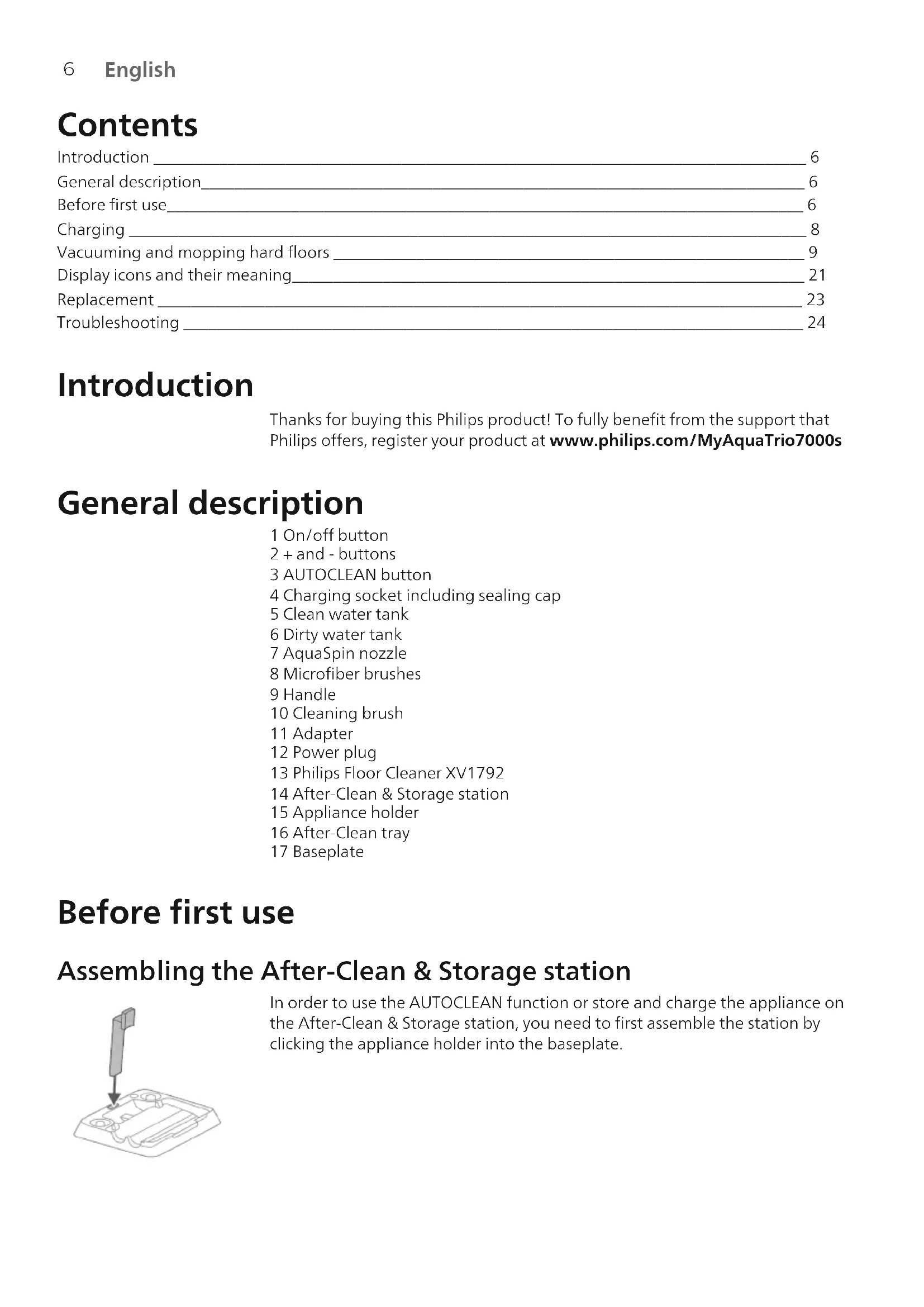 English Contents Introduction _______________________________________________________________________________ 6 General description_________________________________________________________________________ 6 Before first use_____________________________________________________________________________ 6 Charging __________________________________________________________________________________ 8 Vacuuming and mopping hard floors _________________________________________________________ 9 Display icons and their meaning______________________________________________________________ 21 Replacement ______________________________________________________________________________ 23 Troubleshooting ___________________________________________________________________________ 24 Introduction Thanks for buying this Philips product! To fully benefit from the support that Philips offers, register your product at www.philips.com/MyAquaTrio7000s General description 1 On/off button 2 + and - buttons 3 AUTOCLEAN button 4 Charging socket including sealing cap 5 Clean water tank 6 Dirty water tank 7 AquaSpin nozzle 8 Microfiber brushes 9 Handle 10 Cleaning brush 11 Adapter 12 Power plug 13 Philips Floor Cleaner XV1792 14 After-Clean & Storage station 15 Appliance holder 16 After-Clean tray 17 Baseplate Before first use Assembling the After-Clean & Storage station In order to use the AUTOCLEAN function or store and charge the appliance on the After-Clean & Storage station, you need to first assemble the station by clicking the appliance holder into the baseplate.7 English Note: Make sure that the After-Clean tray is placed in the baseplate and that the temperature in the room where the appliance is stored, charged and cleaned is between 5 °C and 35 °C. Note: you can store the cleaning brush in the After-Clean tray as well. 1 To assemble the appliance, insert the handle into the main body ('click'). 2 To store the appliance, you can place it in the After-Clean & Storage station. Slide the appliance on to the appliance holder so that the end of the appliance holder sticks into the appliance. If you need to disassemble the appliance again, follow the steps below: 1 Insert a pin/flat screwdriver into the hole in the back of the appliance and pull up the handle. 2 Pull the handle out of the appliance while continuing to push the screwdriver into the hole.8 English Charging The appliance is equipped with a 25 V Li-Ion battery. Charging takes 4 hours. 1 To charge the appliance, open the sealing cap on the back of the appliance. 2 Insert the power plug into the socket on the back of the appliance. Then insert the adapter into the wall socket. 3 A value between 0% and 90% flashes on the screen to indicate that the appliance is charging. 4 When the appliance is fully charged, the value 100% lights up on the screen. After a few minutes, the display will switch off. 5 Remove the power plug from the socket on the back of the appliance. 6 Close the sealing cap.