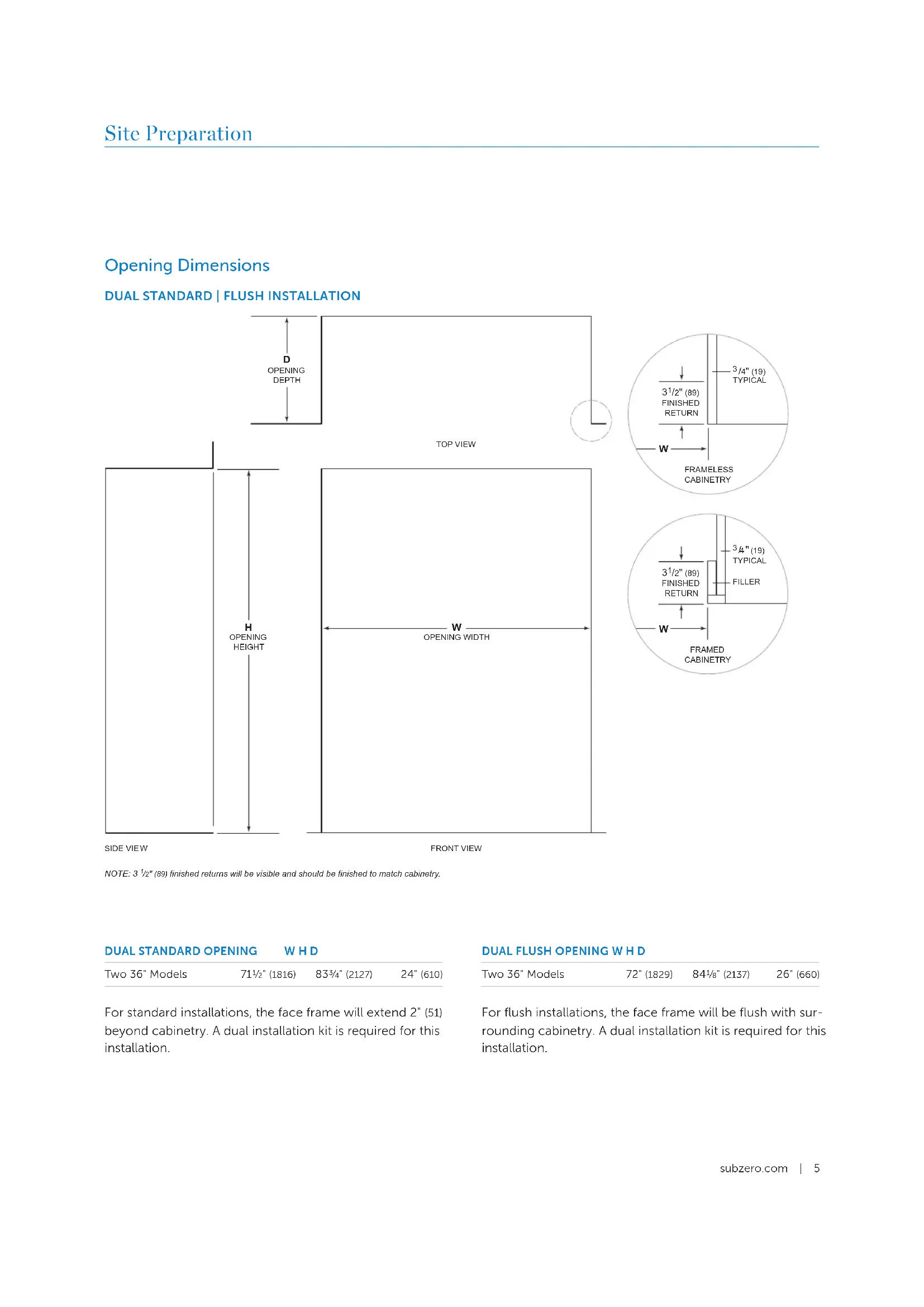 Two 36" Models 71⁄" (1816) 83⁄" (2127) 24" (610) For standard installations, the face frame will extend 2" (51) beyond cabinetry. A dual installation kit is required for this installation.