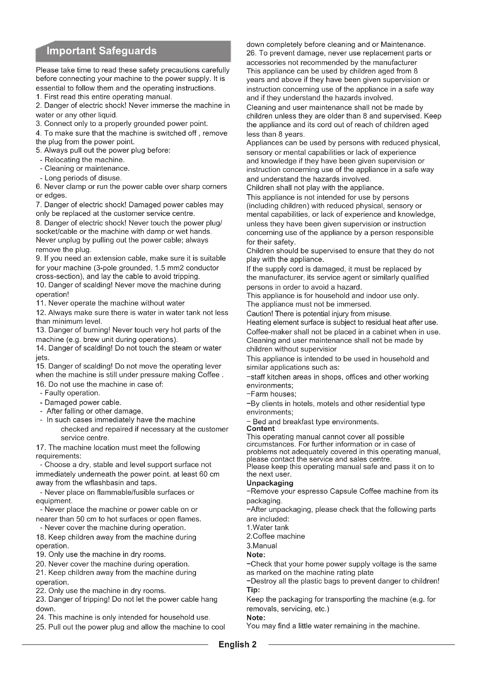 1. Do not immerse the Coffee machine in water.