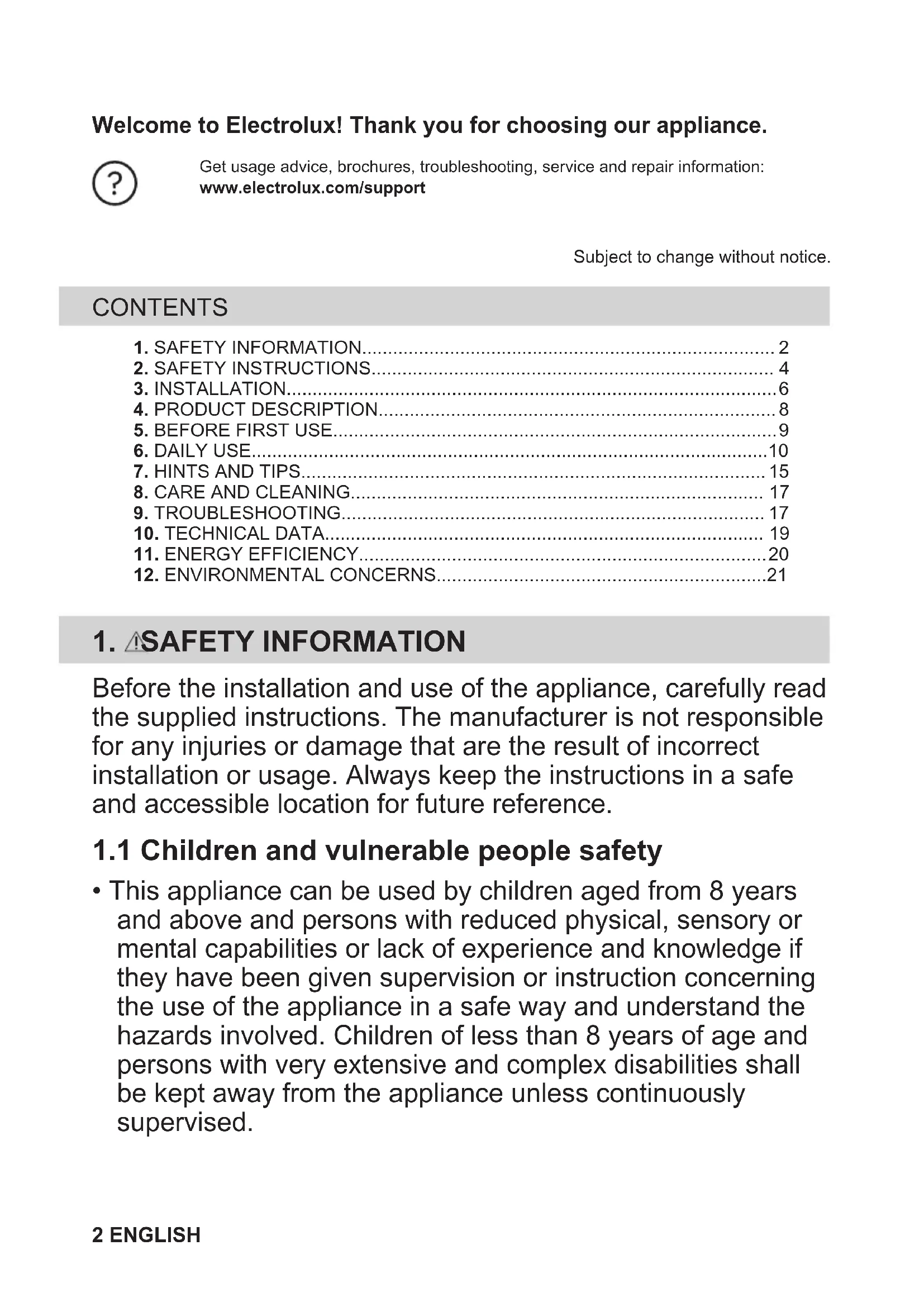 - This appliance can be used by children aged from 8 years and above and persons with reduced physical, sensory or mental capabilities or lack of experience and knowledge if they have been given supervision or instruction concerning the use of the appliance in a safe way and understand the hazards involved. Children of less than 8 years of age and persons with very extensive and complex disabilities shall be kept away from the appliance unless continuously supervised. 2 ENGLISH• Children should be supervised to ensure that they do not play with the appliance.