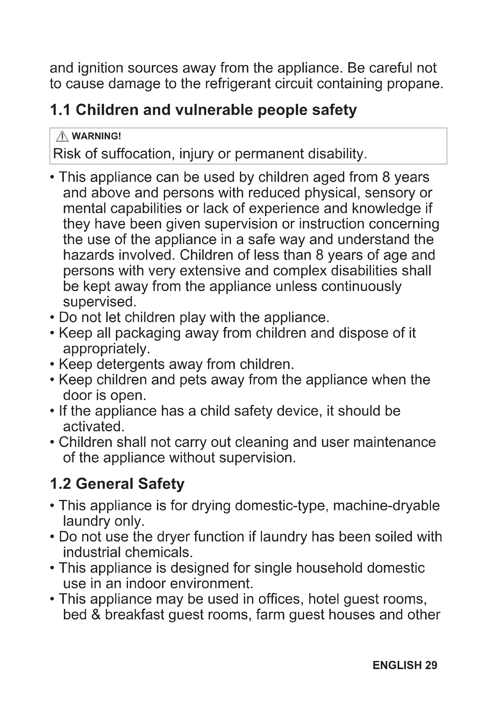 - Do not install the appliance in an environment with no air exchange ENGLISH 31The appliance contains flammable gas, propane (R290), a gas with a high level of environmental compatibility. Keep fire and ignition sources away from the appliance. Be careful not to cause damage to the refrigerant circuit containing propane.