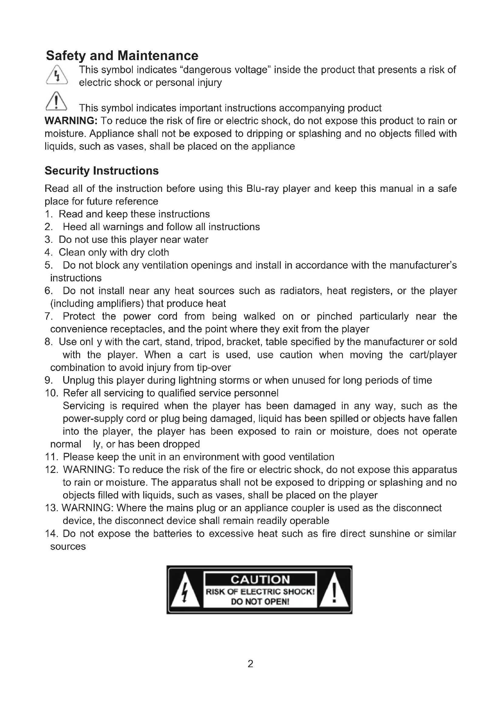 moisture. Appliance shall not be exposed to dripping or splashing and no objects filled with liquids, such as vases, shall be placed on the appliance Security Instructions Read all of the instruction before using this Blu-ray player and keep this manual in a safe place for future reference