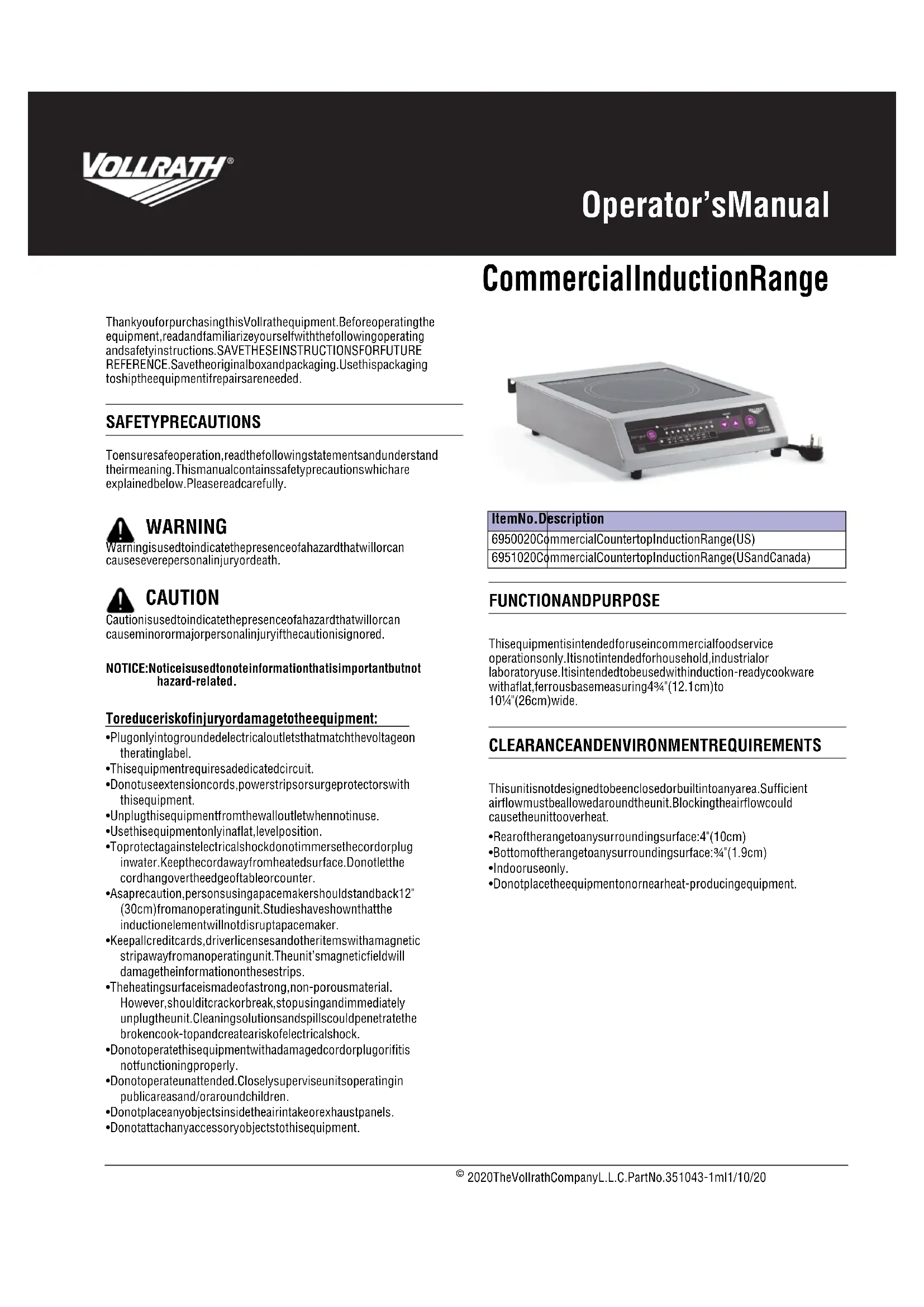 NOTICE: Residue could corrode the surface of the unit. TROUBLESHOOTING WARNING Electrical Shock Hazard Do not spray water or cleaning products. Liquid could contact the electrical components and cause a short circuit or an electrical shock. CAUTION Burn Hazard Allow equipment to cool before moving or cleaning. Problem Might be Caused By Course of Action The unit turned off after ten minute(s). There is not a pot or pan on the induction range or the cookware is not induction- ready. The induction range turned off. This is normal. Make sure the cookware is induction ready. See the Function and Purpose section of this manual. The digital display lights are flashing. The unit is not detecting a pan. Make sure there is a pot or pan on the range, Make sure the cookware is induction ready. See the Function and Purpose section of this manual. The heating LED is flashing. If the LED flashes twice, pauses and then repeats the pattern, the unit is in overheat protection mode. Remove cookware. Let the cooking surface cool. If the LED flashes 9 times, pauses and then repeats the pattern, the cookware is not induction ready. Use induction-ready cookware. See the Function and Purpose section of this manual. If the LED flashes 6 times, pauses and then repeats the pattern, there is problem with the coil core. Contact Vollrath Technical Services. The unit suddenly stopped working. The unit may be too close to an external heat source or the air intake may be restricted. Relocate the unit away from any external heat source. Clear any obstructions to the air intake.© 2020 The Vollrath Company L.L.C. Part No. 351043-1 ml 1/10/20 www.vollrath.com The Vollrath Company, L.L.C. 1236 North 18th Street Sheboygan, WI 53081-3201 U.S.A. Main Tel: 800.624.2051 or 920.457.4851 Main Fax: 800.752.5620 or 920.459.6573 Customer Service: 800.628.0830 Canada Customer Service: 800.695.8560 Technical Services techservicereps@vollrathco.com Induction Products: 800.825.6036 Countertop Warming Products: 800.354.1970 Toasters: 800-309-2250 All Other Products: 800.628.0832 FCC STATEMENT This equipment has been tested and found to comply with Part 18 of FCC Rules. These limits are designed to provide reasonable protection against harmful interference in a residential installation. This equipment generates, uses and can radiate radio frequency energy and, if not installed and used in accordance with the instructions, may cause harmful interference to radio communications. However, there is no guarantee that interference will not occur in a particular installation. If this equipment does cause harmful interference to radio or television reception, which can be determined by turning the equipment off and on, the user is encouraged to try to correct the interference by one or more of the following measures: