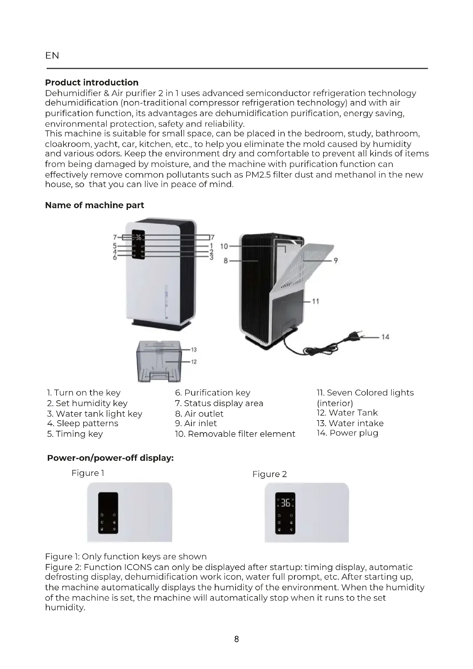 Figure 1 Figure 2 Figure 1: Only function keys are shown Figure 2: Function ICONS can only be displayed after startup: timing display, automatic defrosting display, dehumidification work icon, water full prompt, etc. After starting up, the machine automatically displays the humidity of the environment. When the humidity of the machine is set, the machine will automatically stop when it runs to the set humidity.