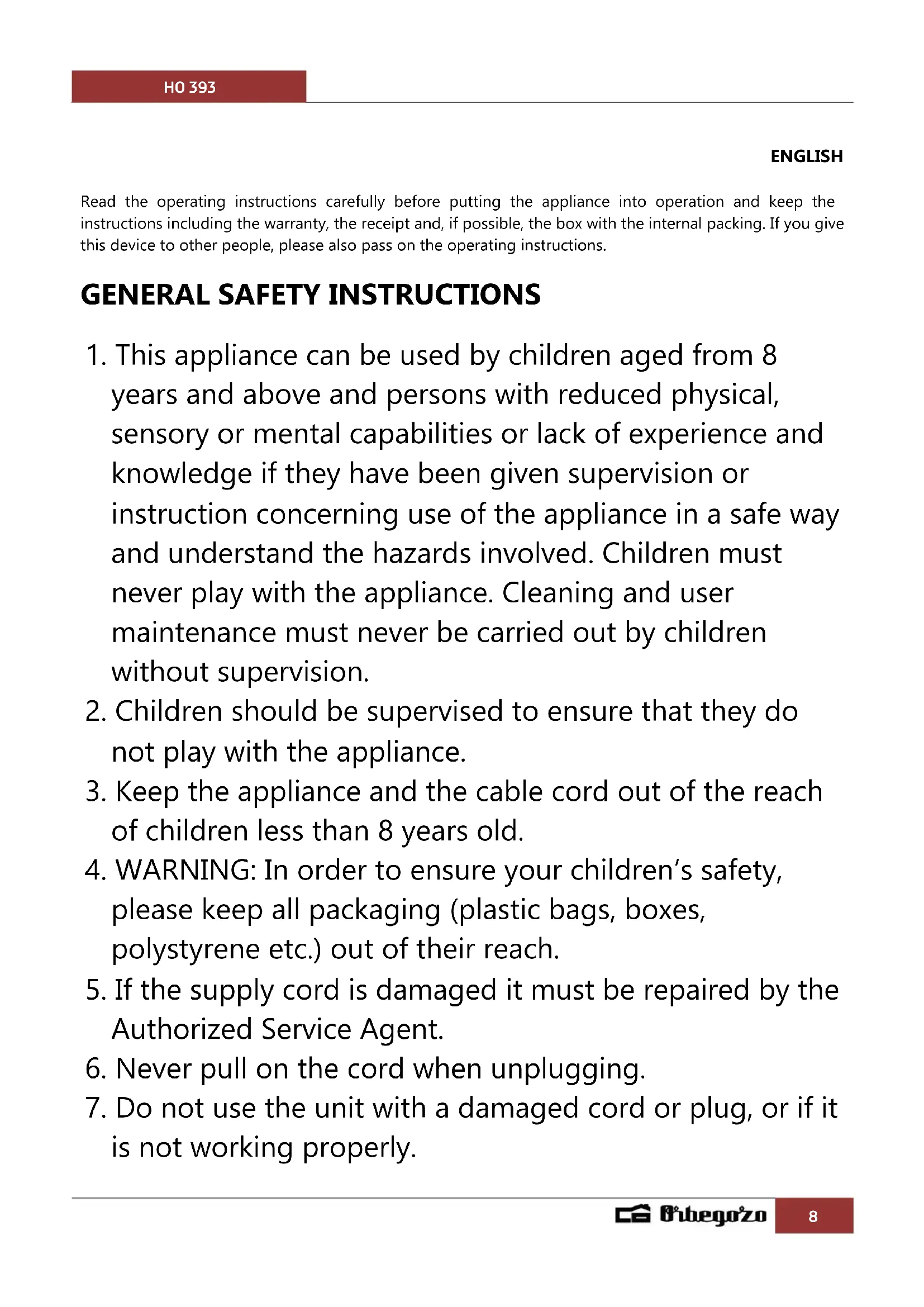 USER MANUAL HO 393 Orbegozo
