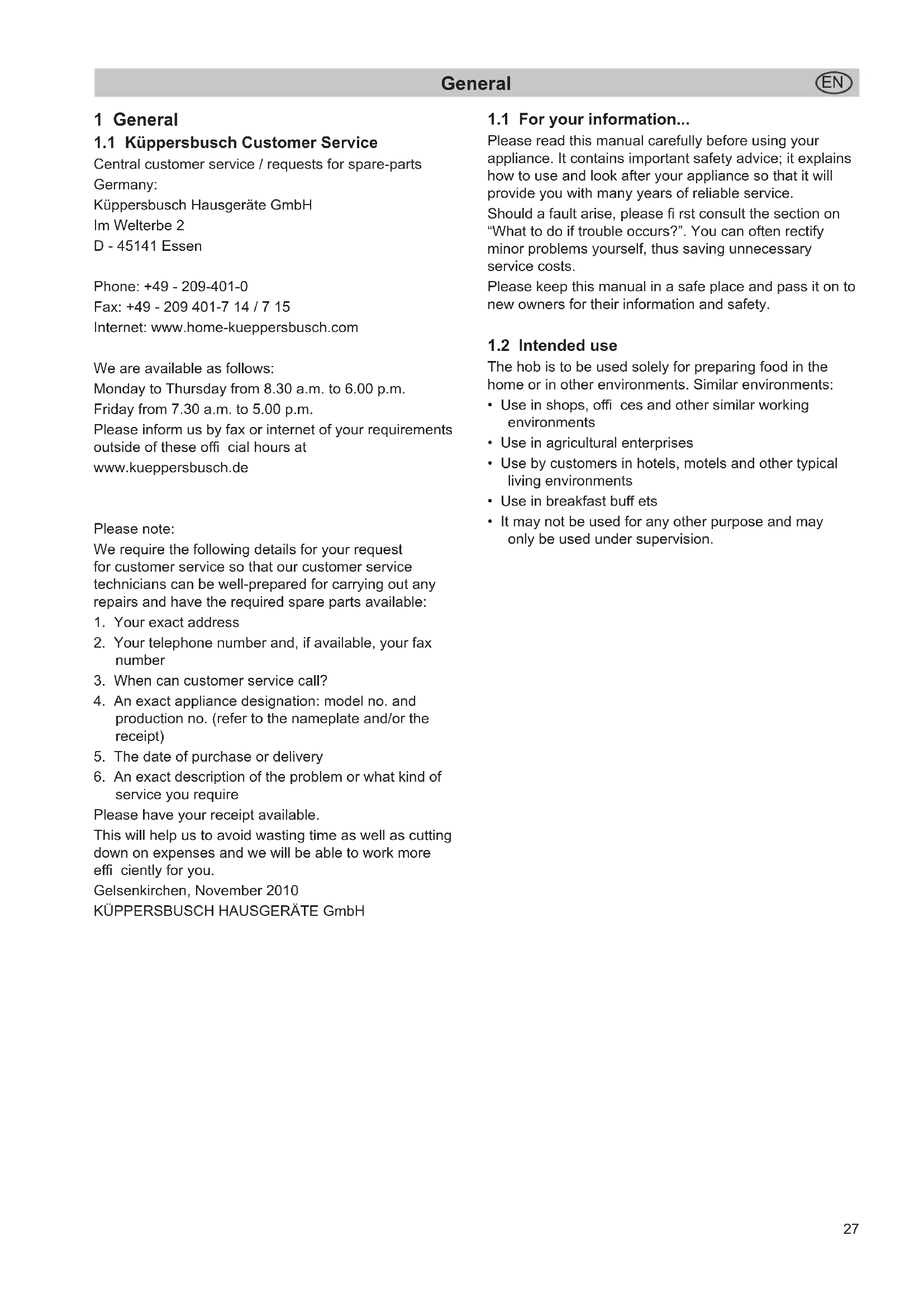 Central customer service / requests for spare-parts Germany: Küppersbusch Hausgeräte GmbH Im Welterbe 2 D - 45141 Essen Phone: +49 - 209-401-0 Fax: +49 - 209 401-7 14 / 7 15 Internet: www.home-kueppersbusch.com We are available as follows: Monday to Thursday from 8.30 a.m. to 6.00 p.m. Friday from 7.30 a.m. to 5.00 p.m. Please inform us by fax or internet of your requirements outside of these offi cial hours at www.kueppersbusch.de Please note: We require the following details for your request for customer service so that our customer service technicians can be well-prepared for carrying out any repairs and have the required spare parts available: