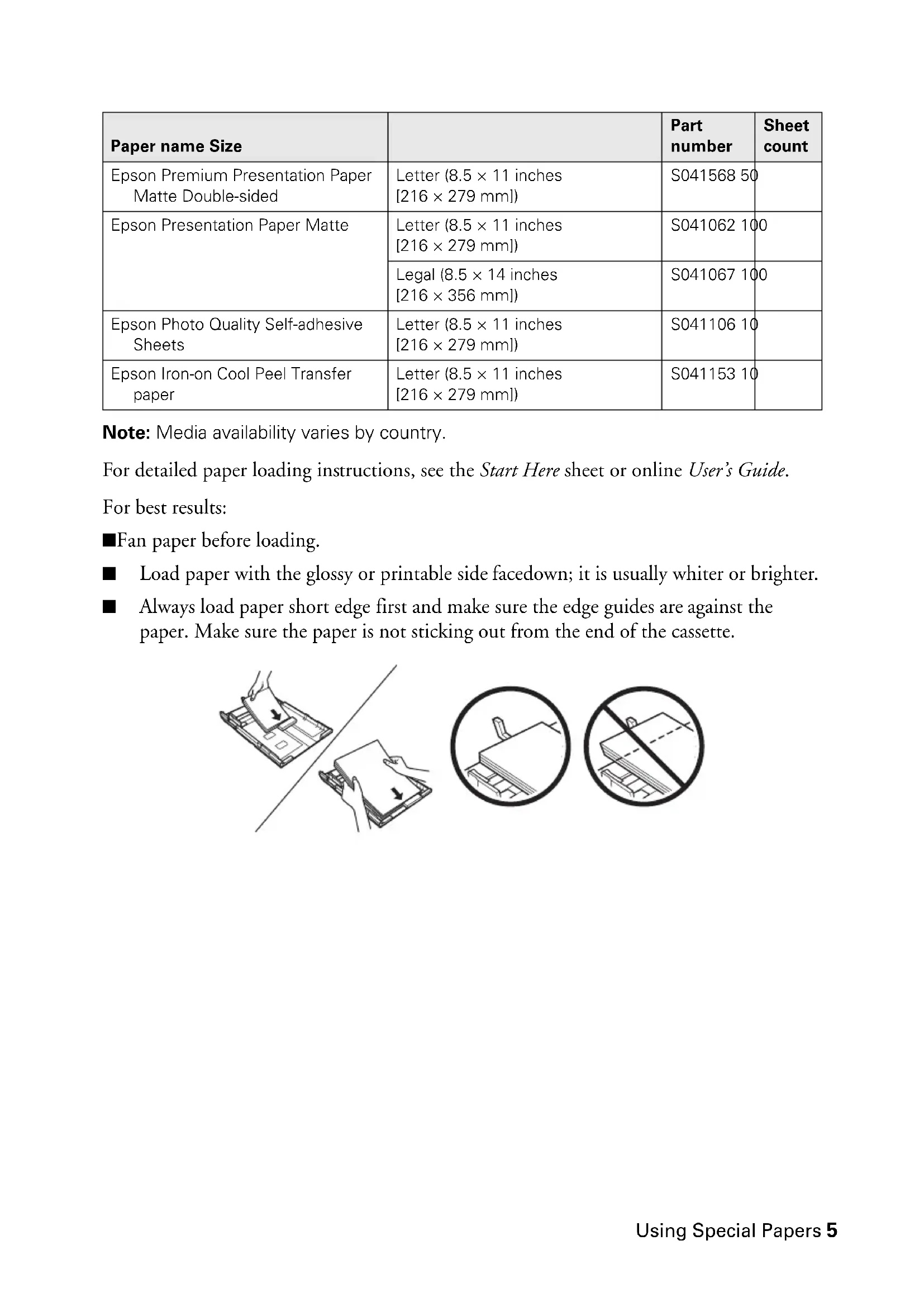 100Using Special Papers 5 Note: Media availability varies by country. For detailed paper loading instructions, see the Start Here sheet or online User’s Guide. For best results: ■ Fan paper before loading. ■ Load paper with the glossy or printable side facedown; it is usually whiter or brighter. ■ Always load paper short edge first and make sure the edge guides are against the paper. Make sure the paper is not sticking out from the end of the cassette. Epson Premium Presentation Paper Matte Double-sided Letter (8.5 × 11 inches [216 × 279 mm]) S041568 50 Epson Presentation Paper Matte Letter (8.5 × 11 inches [216 × 279 mm]) S041062 100 Legal (8.5 × 14 inches [216 × 356 mm]) S041067 100 Epson Photo Quality Self-adhesive Sheets Letter (8.5 × 11 inches [216 × 279 mm]) S041106 10 Epson Iron-on Cool Peel Transfer paper Letter (8.5 × 11 inches [216 × 279 mm]) S041153 10 Paper name Size Part number Sheet count6 Copying a Document or Photo Copying a Document or Photo Follow the instructions in this section to position your originals correctly on the scanner glass and make color or black-and-white copies.
