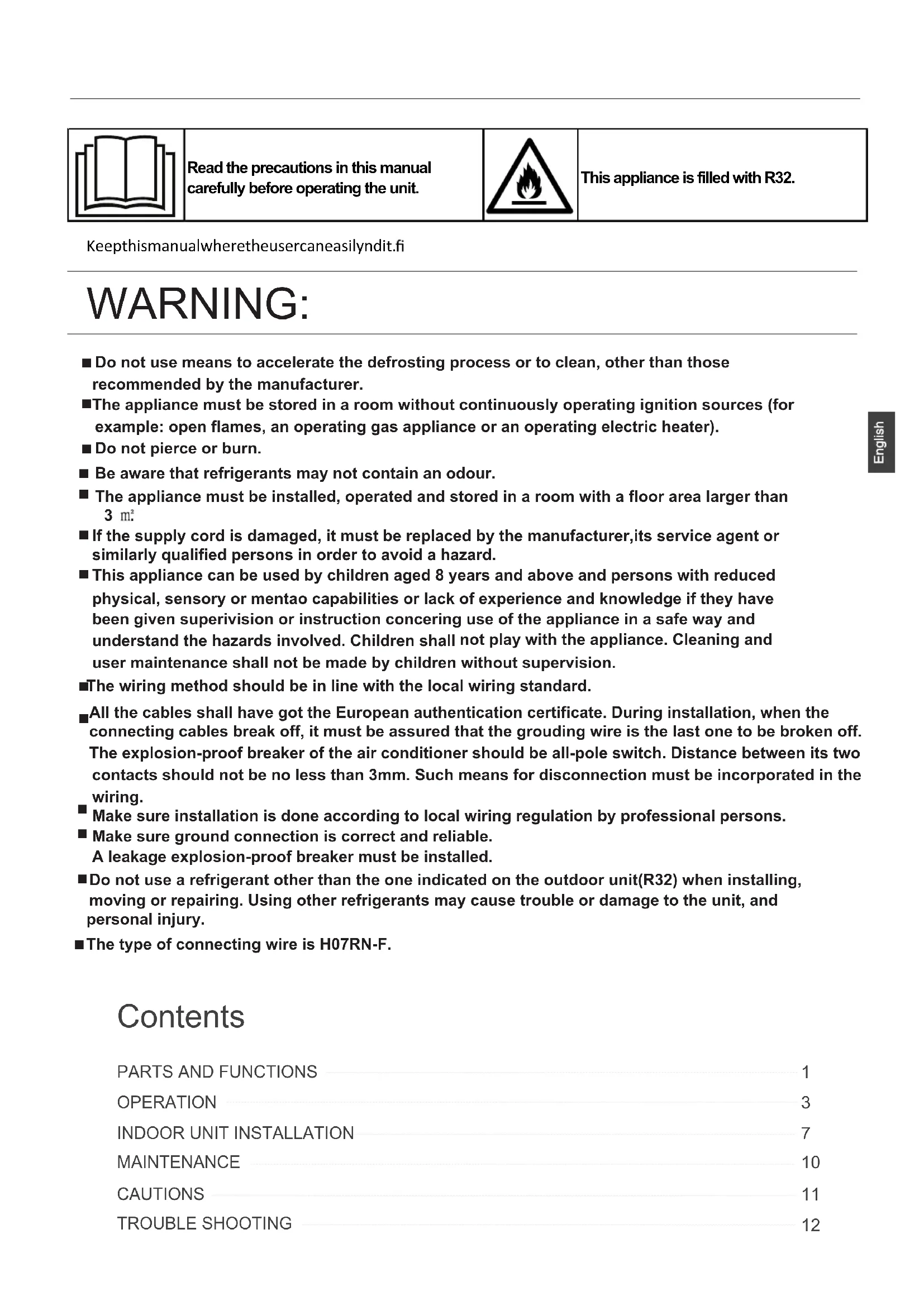 A leakage explosion-proof breaker must be installed.Make sure ground connection is correct and reliable.Read the precautions in this manualcarefully before operating the unit.This appliance is filled with R32.Do not use means to accelerate the defrosting process or to clean, other than those recommended by the manufacturer. Keep this manual where the user can easily nd it.The appliance must be stored in a room without continuously operating ignition sources (for example: open flames, an operating gas appliance or an operating electric heater).Do not pierce or burn.
