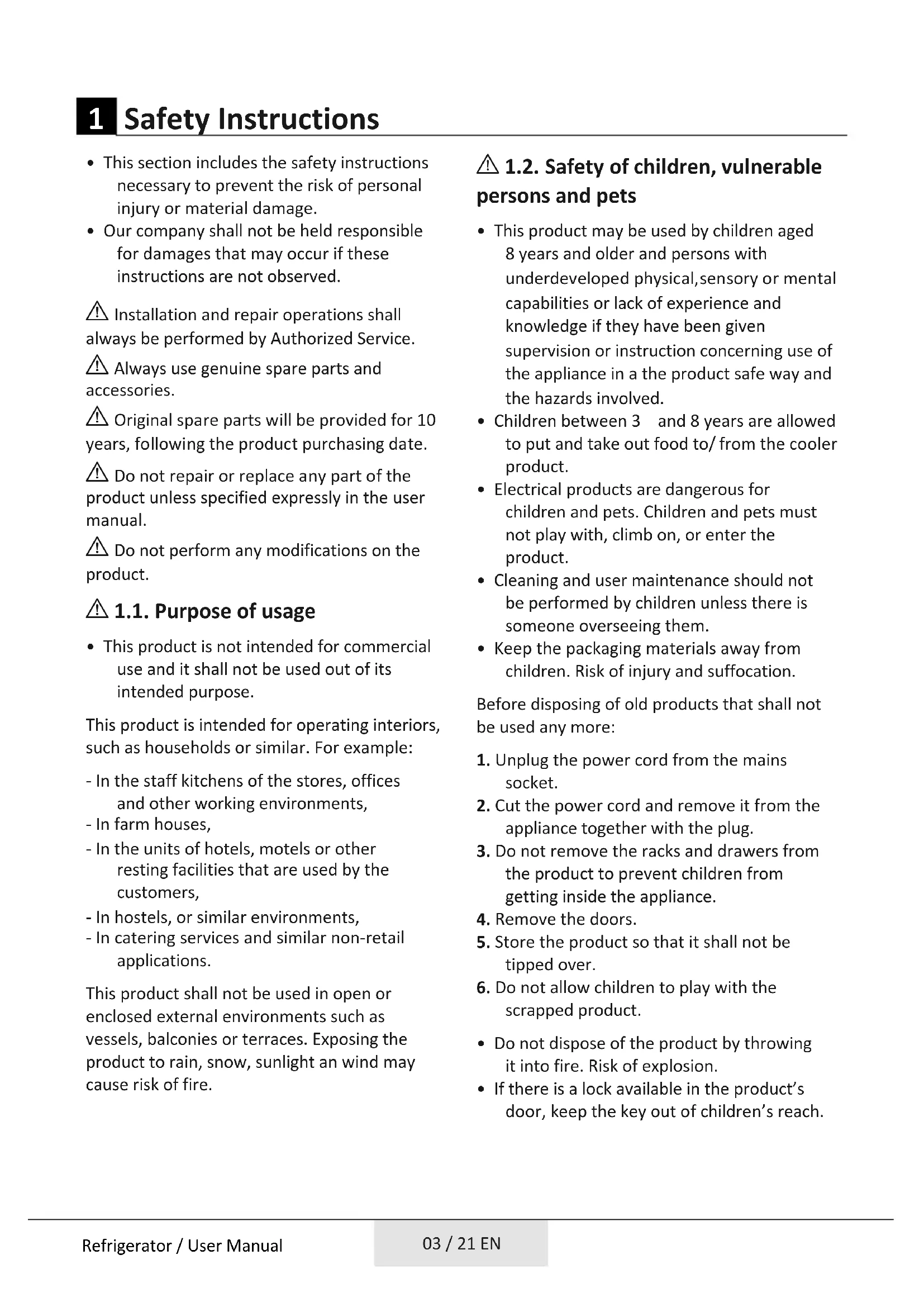 - If there is a lock available in the product’s door, keep the key out of children’s reach. 03 / 21 EN Refrigerator / User ManualSafety Instructions A 1.3. Electrical safety