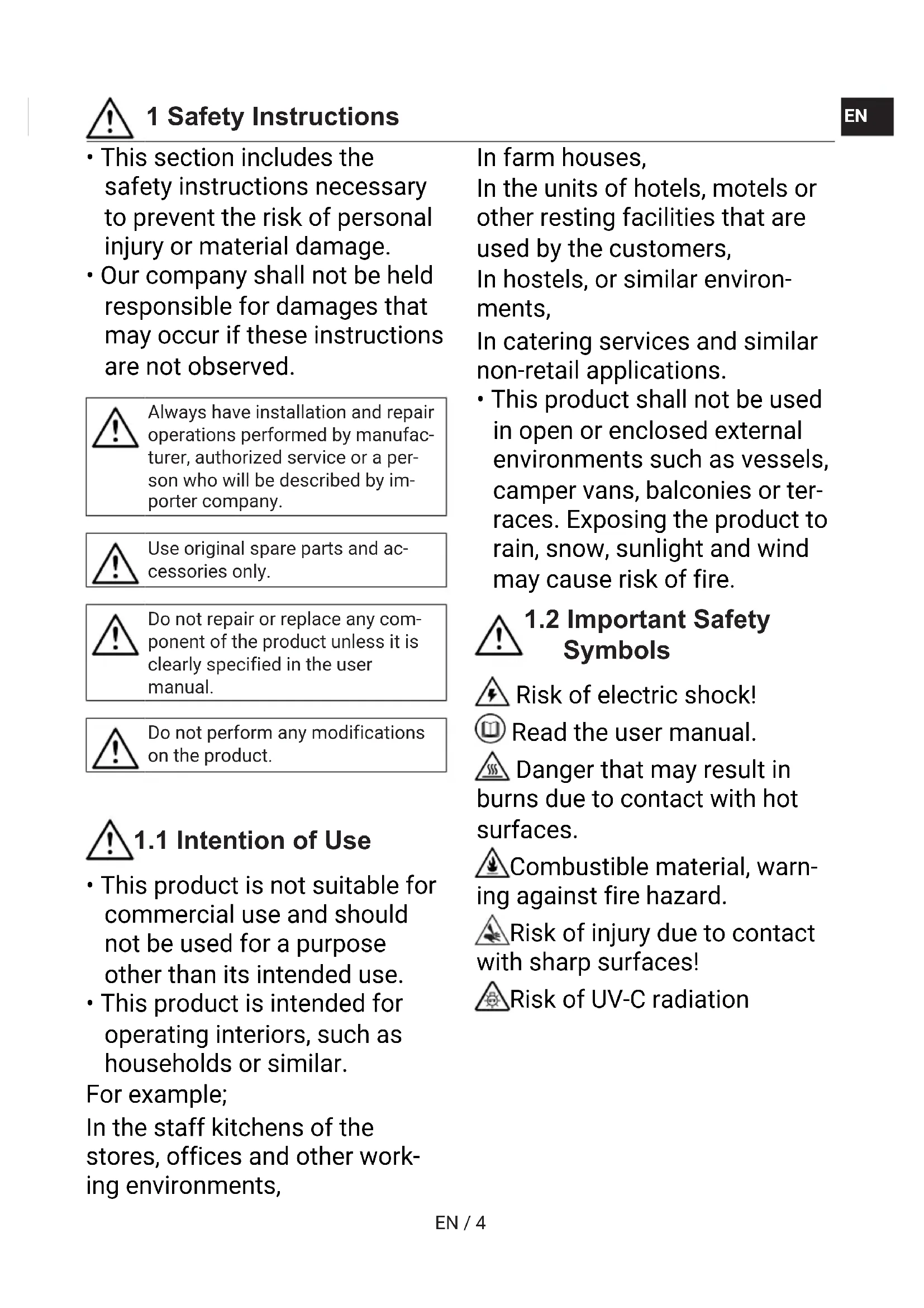 - Our company shall not be held responsible for damages that may occur if these instructions are not observed. Always have installation and repair operations performed by manufac- turer, authorized service or a per- son who will be described by im- porter company. Use original spare parts and ac- cessories only. Do not repair or replace any com- ponent of the product unless it is clearly specified in the user manual. Do not perform any modifications on the product.