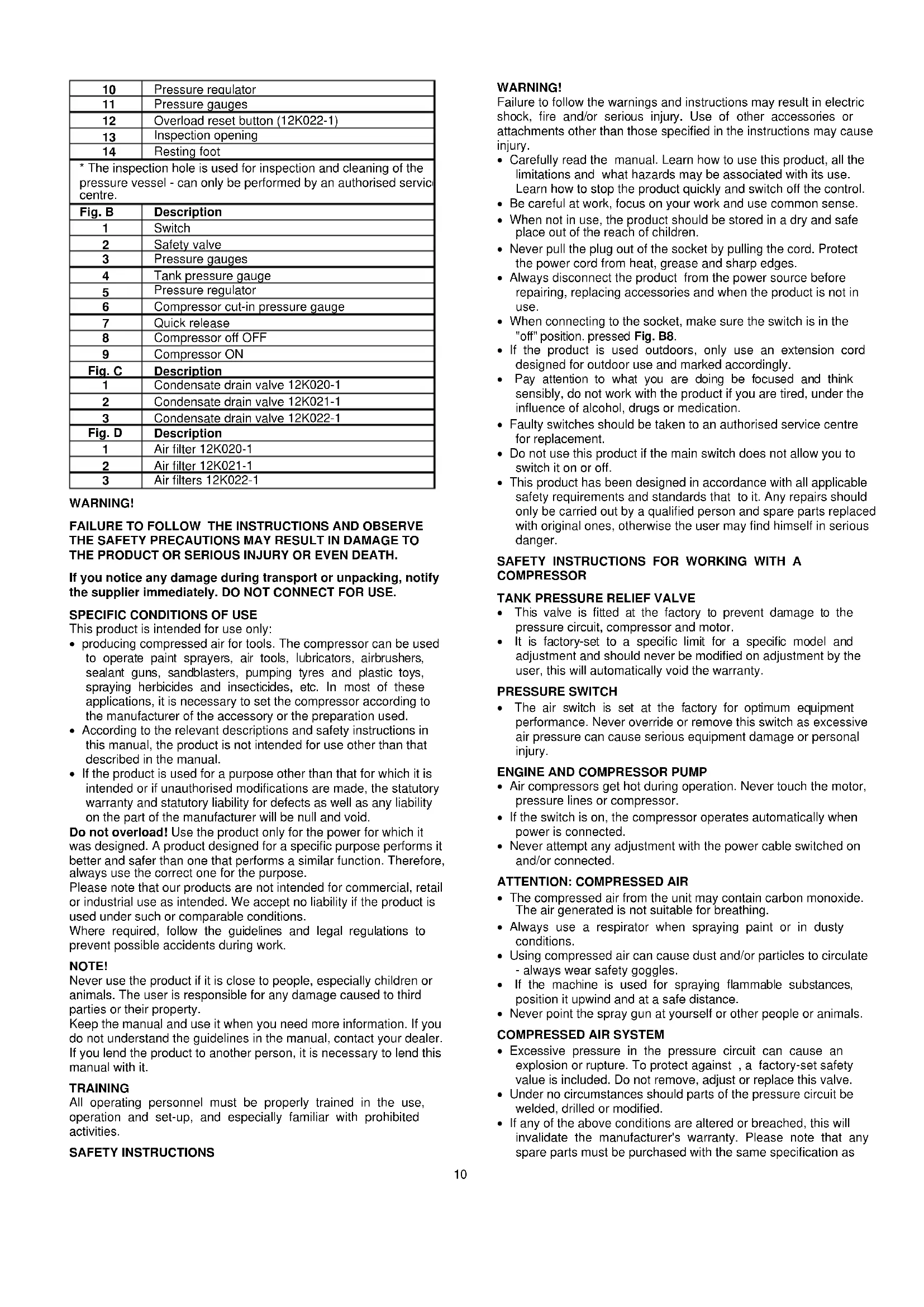 - The use of compressed air for the various purposes envisaged (inflating, pneumatic tools, painting, washing with water-based detergents only, etc.) requires knowledge of and compliance with the rules established for each individual application.