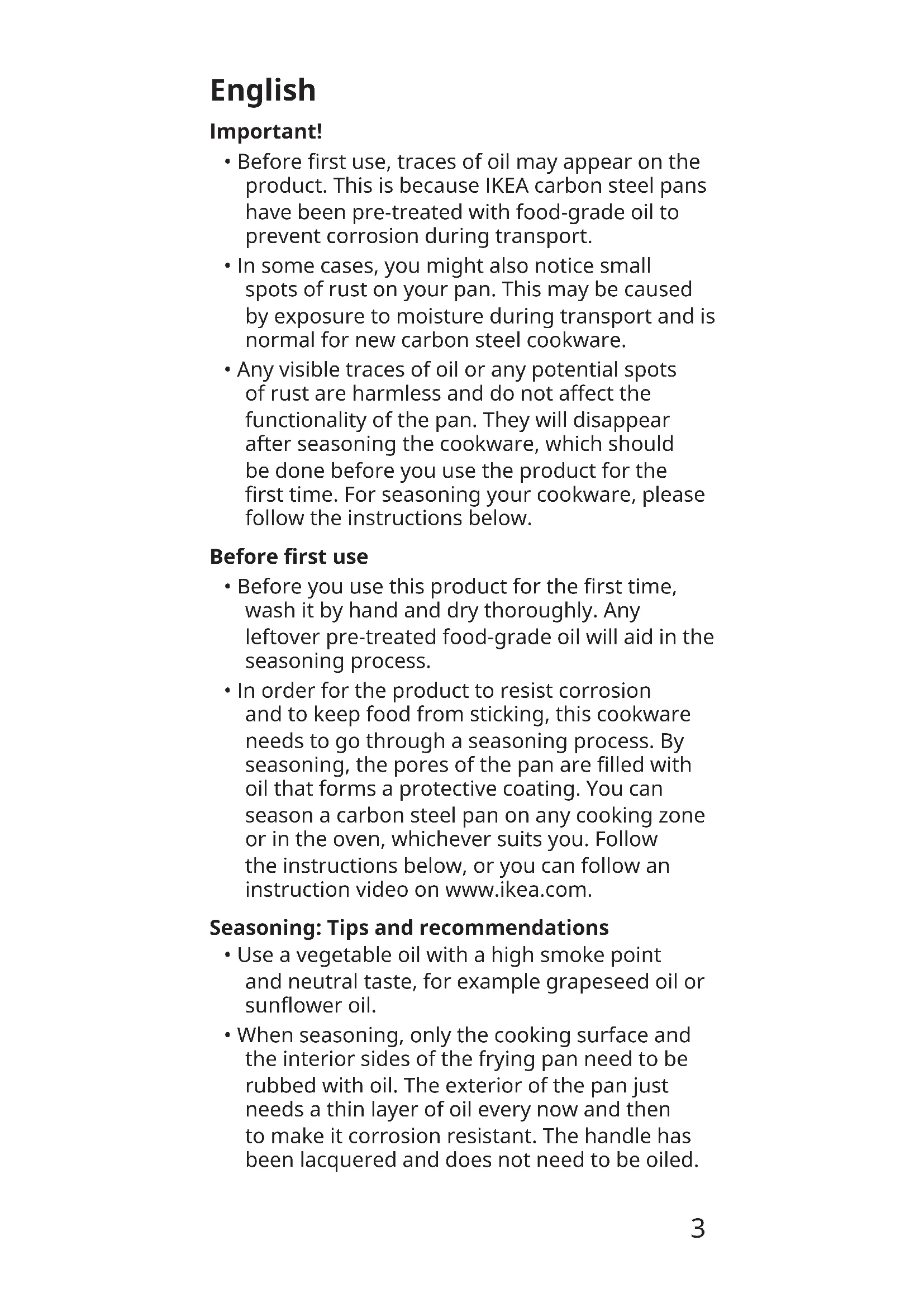 - Before rst use, traces of oil may appear on the product. This is because IKEA carbon steel pans have been pre-treated with food-grade oil to prevent corrosion during transport.