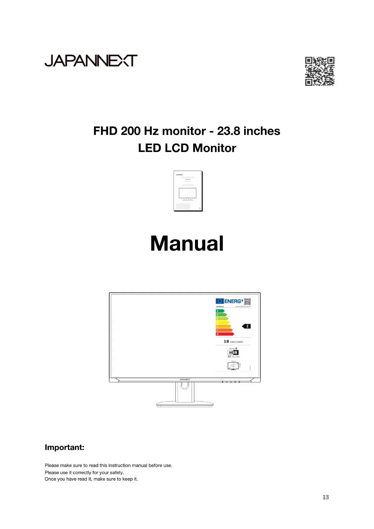 Download the instructions for your Monitor in PDF format for free! Find your manual JNI238FHD120FHSPPK - Japannext and take your electronic device back in hand. On this page are published all the documents necessary for the use of your device. JNI238FHD120FHSPPK by Japannext.