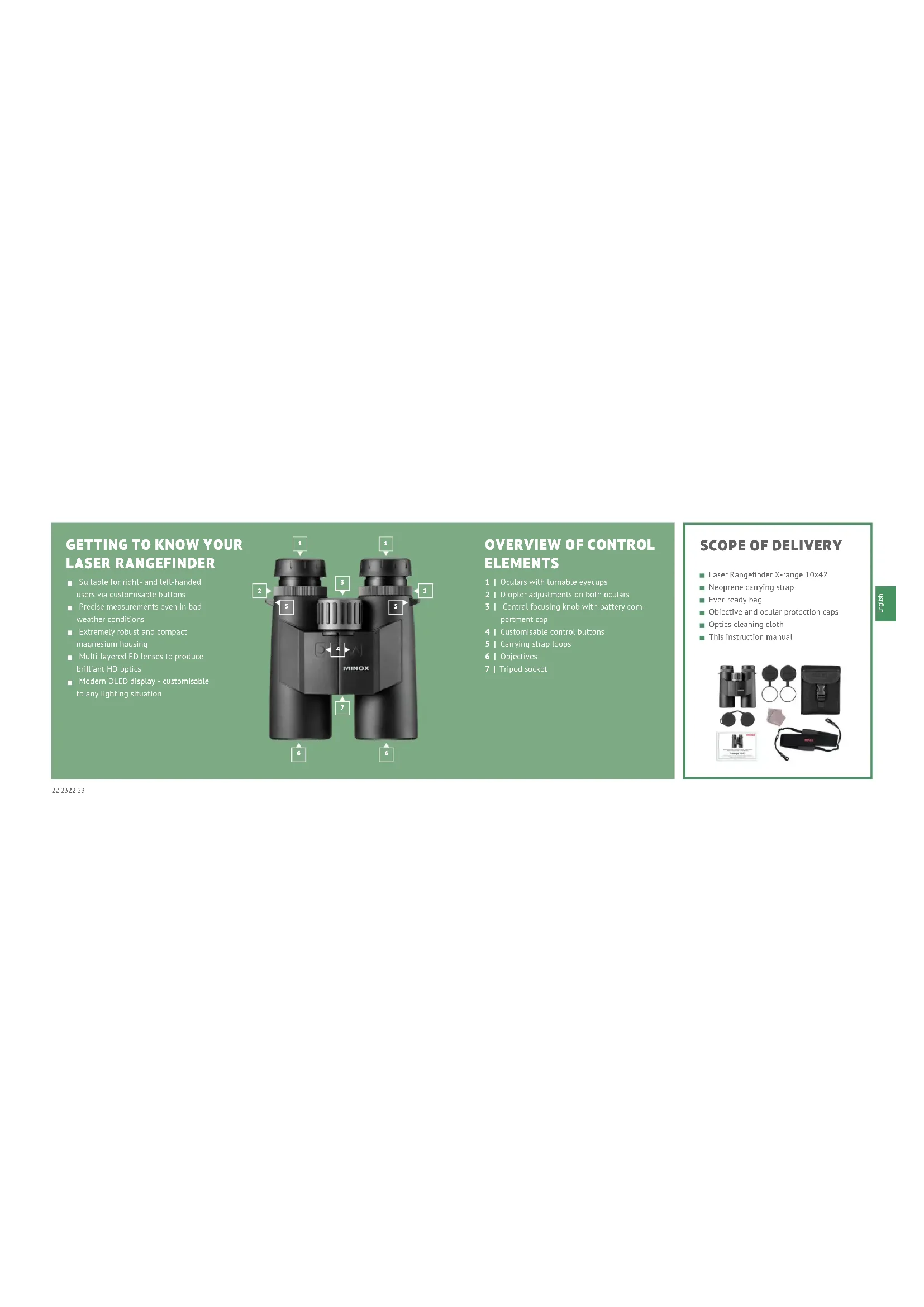 This instruction manual is part of the MINOX Laser Rangefinder X-range 10x42 (hereinafter named only “X-range” or “binocu- lars”). It is part of the product and contains important informa- tion on commissioning, handling and disposal. Please carefully read the operating instructions, especially the safety instruc- tions, before using the binoculars for the first time. Non-com- pliance with these operating instructions can cause damage to the binoculars. The operating instructions are based on the standards and rules applicable within the European Union. Ob- serve also country-specific guidelines and laws if used outside the EU! Keep the operating instructions for the further use. If you pass the X-range binoculars on to a third party, be sure to include this user manual. Use the binoculars only as described in this manual. Any other use is considered improper and can lead to material damage. The manufacturer or dealer assumes no liability for damage caused by improper or incorrect use, and for unauthorised modifications. We have made every eort to ensure that these operating in- structions are as complete and accurate as possible. Neverthe- less, it cannot be guaranteed that errors or omissions will not have occurred during the printing process. The accessories in- cluded in the delivery may dier slightly from those described. This package can be changed without prior notice. The following symbols and signal words are used in these op- erating instructions, on the device or on the packaging. DANGER! This symbol/signal word indicates a hazard with a high degree of risk, which if not avoided, will result in death or serious injury. WARNING! This signal word warns of possible damage to property. NEVER look directly at the sun or into laser sources with your binoculars. This can cause irreparable damage to the eyes. Be sure not to allow your binoculars to get into the hands of children. There is a danger of swallowing small parts or strangulation caused by the carrying strap. Do not touch metallic surfaces if the binoculars have become very hot or very cold. Always replace the protective caps after use. This protects the lenses from damage and can avoid fire hazard caused by the bundling of sunlight through your binoculars. Additional safety instructions regarding the laser and batteries The product implements an invisible laser beam. Please pay attention to the following: Do not point the laser at eyes Do not point the laser at people Do not look into the laser with optical devices Remove your finger from the measuring button when you are not measuring. This will prevent accidental activation of the laser. DO NOT disassemble, alter or repair the binoculars yourself. The laser can be hazardous to your health. WARNING This product has been tested to meet the following standards: CLASS 1 LASER PRODUCT. INVISIBLE LASER RADIATION. NEVER LOOK WITH OPTICAL DE- VICES INTO THE LASER. (BINOCULARS, TELESCOPES) This device complies with the regulations for laser class 1 in accordance with applicable standards IEC 60825-1:2007 Edi- tion 2 (TÜV SÜD), EN 60825-1:2007 and CE according to EN 61326-1:2013. This product complies with the regulations according to the FDA 21 CFR 1040.10 and 1040.11, and meets the requirements of FDA performance standards and the FCC Rules and Regula- tions section 15 B:2018 using the test method ANSIC63.4-2014. The operation of the device is subject to the following restric- tions: (1) This device may not cause harmful interferences, and (2) this device must allow the reception of any interferences, including those that may cause undesirable operation. MINOX GmbH, Ziegelstadel 20, 88316 Isny, Germany CR2 lithium battery safety instructions Make sure that the polarity is correct when inserting the battery (+/-) Do not attempt to charge the battery Do not throw the battery into fire or water Do not disassemble the battery When discarding the battery, please observe applicable laws26 2726 27 English FIRST USE Check the scope of delivery DANGER! There is a danger of suocation for children who may play with the packaging film. Do not let children play with the packaging film. They can get caught in it and choke to death.