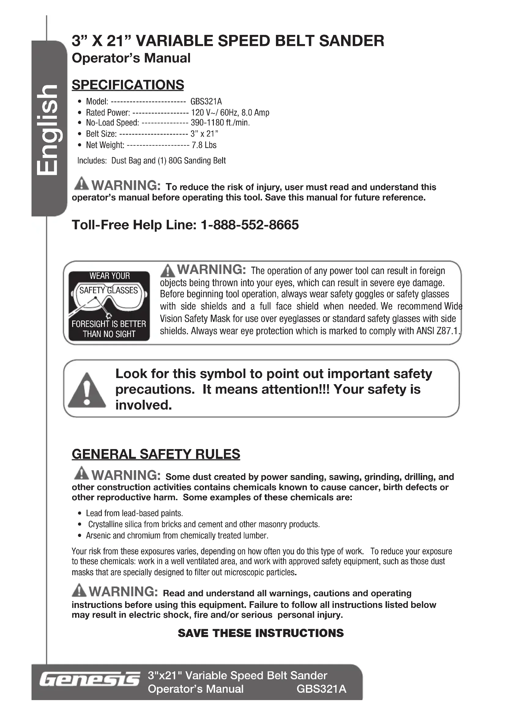 - Model: ------------------------ GBS321A• Rated Power: ------------------ 120 V~/ 60Hz, 8.0 Amp• No-Load Speed: --------------- 390-1180 ft./min. • Belt Size: ---------------------- 3” x 21” • Net Weight: -------------------- 7.8 LbsIncludes: Dust Bag and (1) 80G Sanding Belt