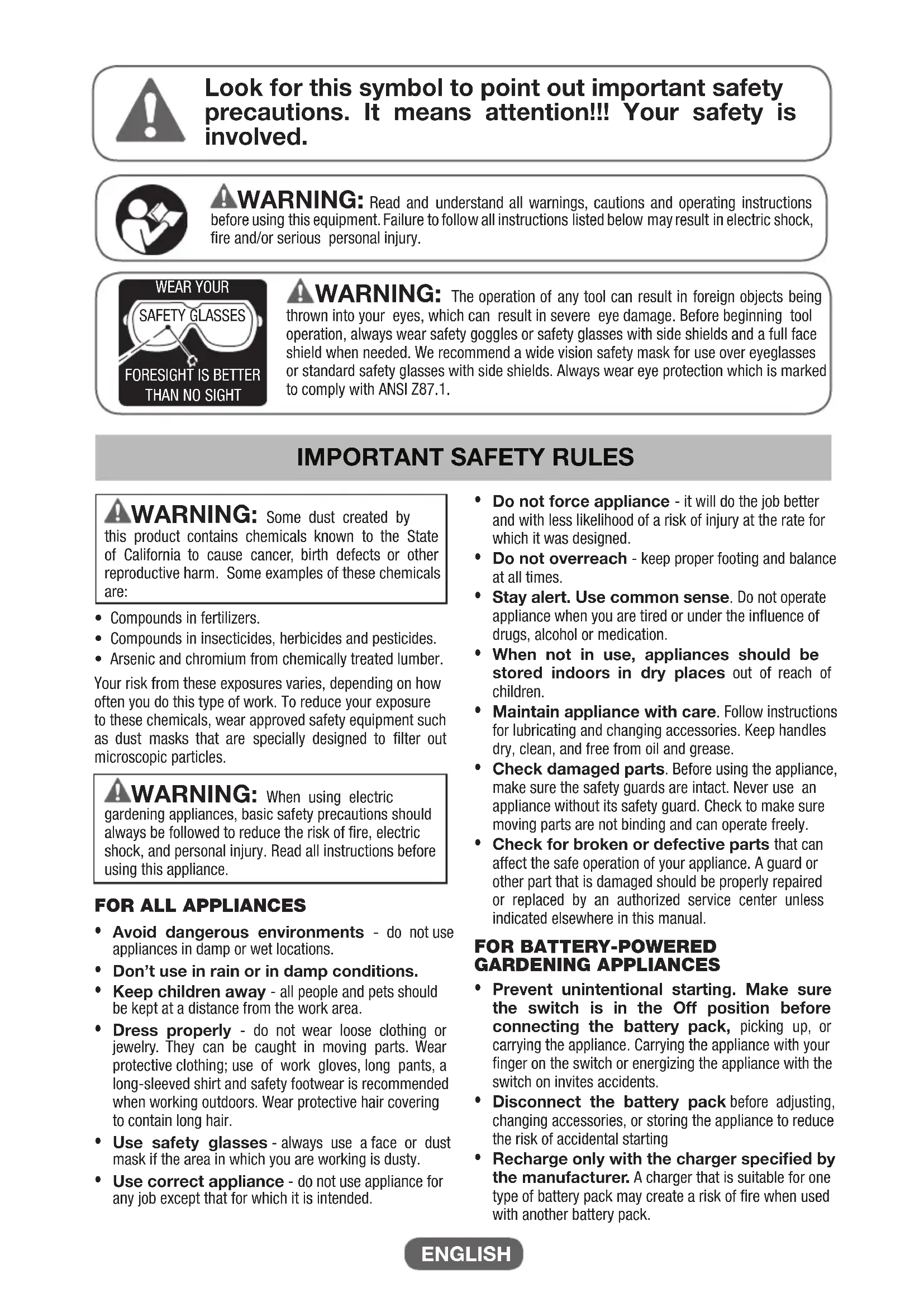 gardening appliances, basic safety precautions should always be followed to reduce the risk of fire, electric shock, and personal injury. Read all instructions before using this appliance.