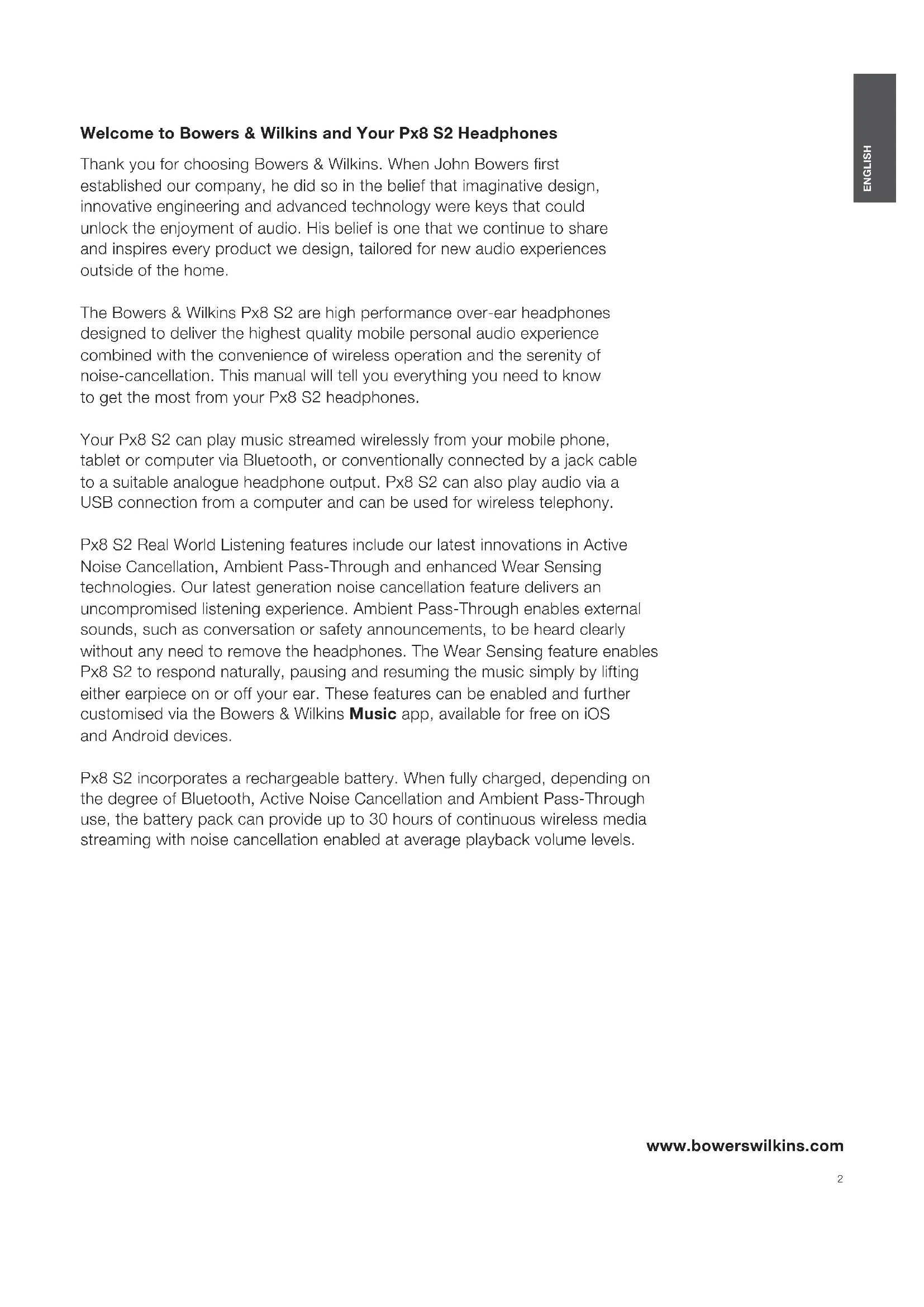 The Bowers & Wilkins Px8 S2 are high performance over-ear headphones designed to deliver the highest quality mobile personal audio experience combined with the convenience of wireless operation and the serenity of noise-cancellation. This manual will tell you everything you need to know to get the most from your Px8 S2 headphones.