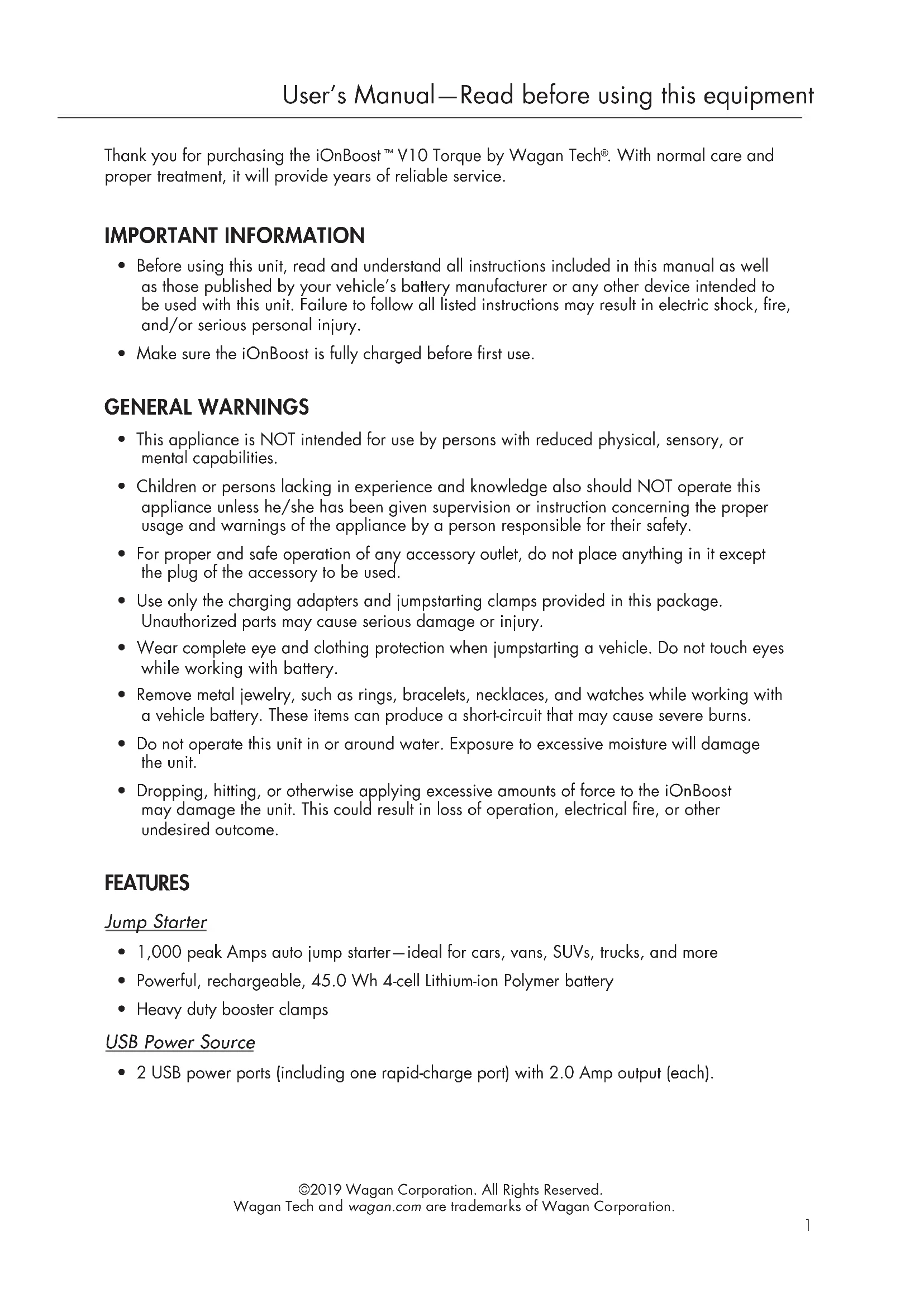 iOnBoost.©2019 Wagan Corporation. All Rights Reserved. Wagan Tech and wagan.com are trademarks of Wagan Corporation. User’s Manual—Read before using this equipment