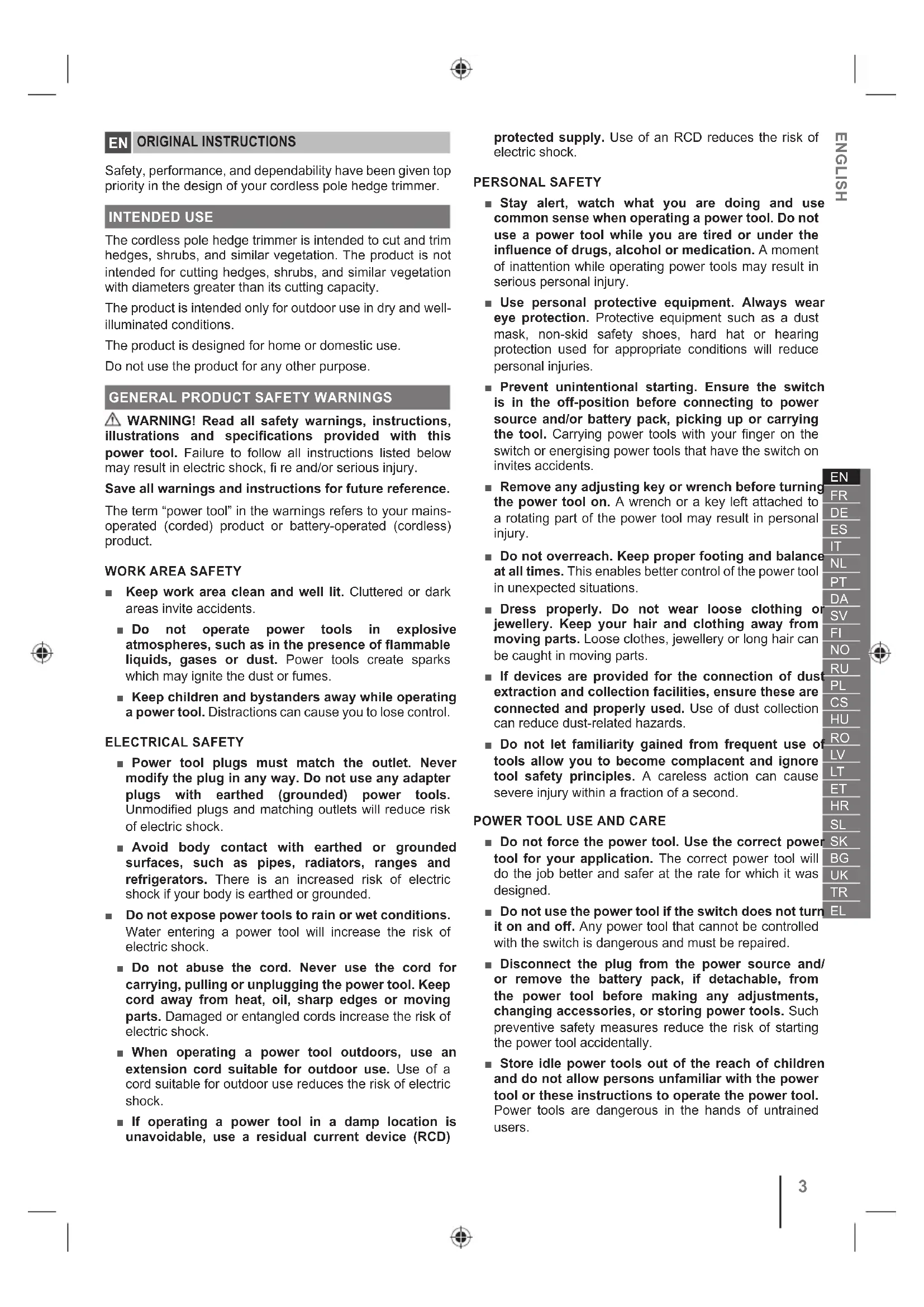 ORIGINAL INSTRUCTIONS Safety, performance, and dependability have been given top priority in the design of your cordless pole hedge trimmer. INTENDED USE The cordless pole hedge trimmer is intended to cut and trim hedges, shrubs, and similar vegetation. The product is not intended for cutting hedges, shrubs, and similar vegetation with diameters greater than its cutting capacity. The product is intended only for outdoor use in dry and well- illuminated conditions. The product is designed for home or domestic use. Do not use the product for any other purpose.