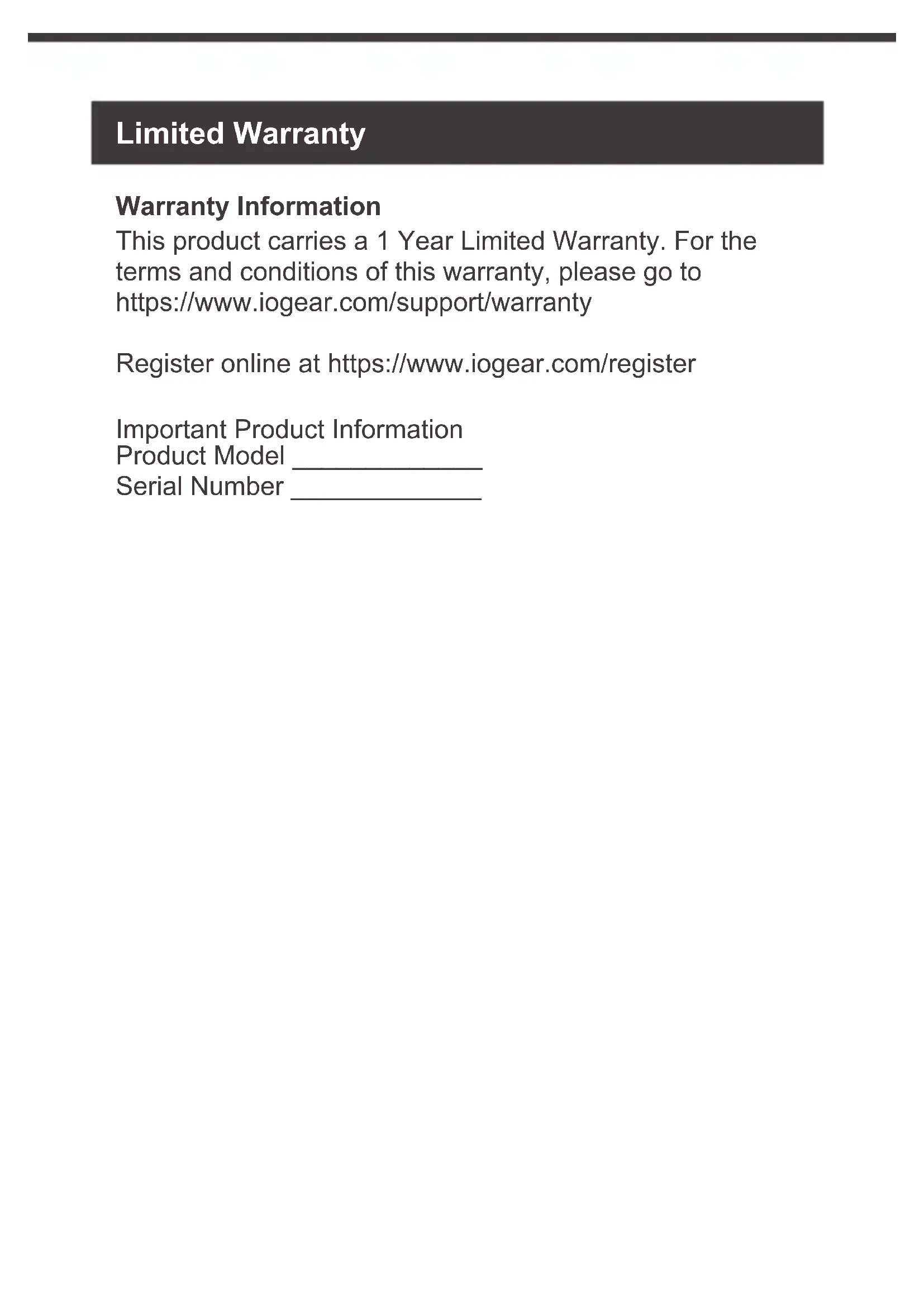 HDDWarranty Information This product carries a 1 Year Limited Warranty. For the terms and conditions of this warranty, please go to https://www.iogear.com/support/warranty Register online at https://www.iogear.com/register Important Product Information Product Model _____________ Serial Number _____________ Limited WarrantyContact WE’RE HERE TO HELP YOU! NEED ASSISTANCE SETTING UP THIS PRODUCT? Make sure you: