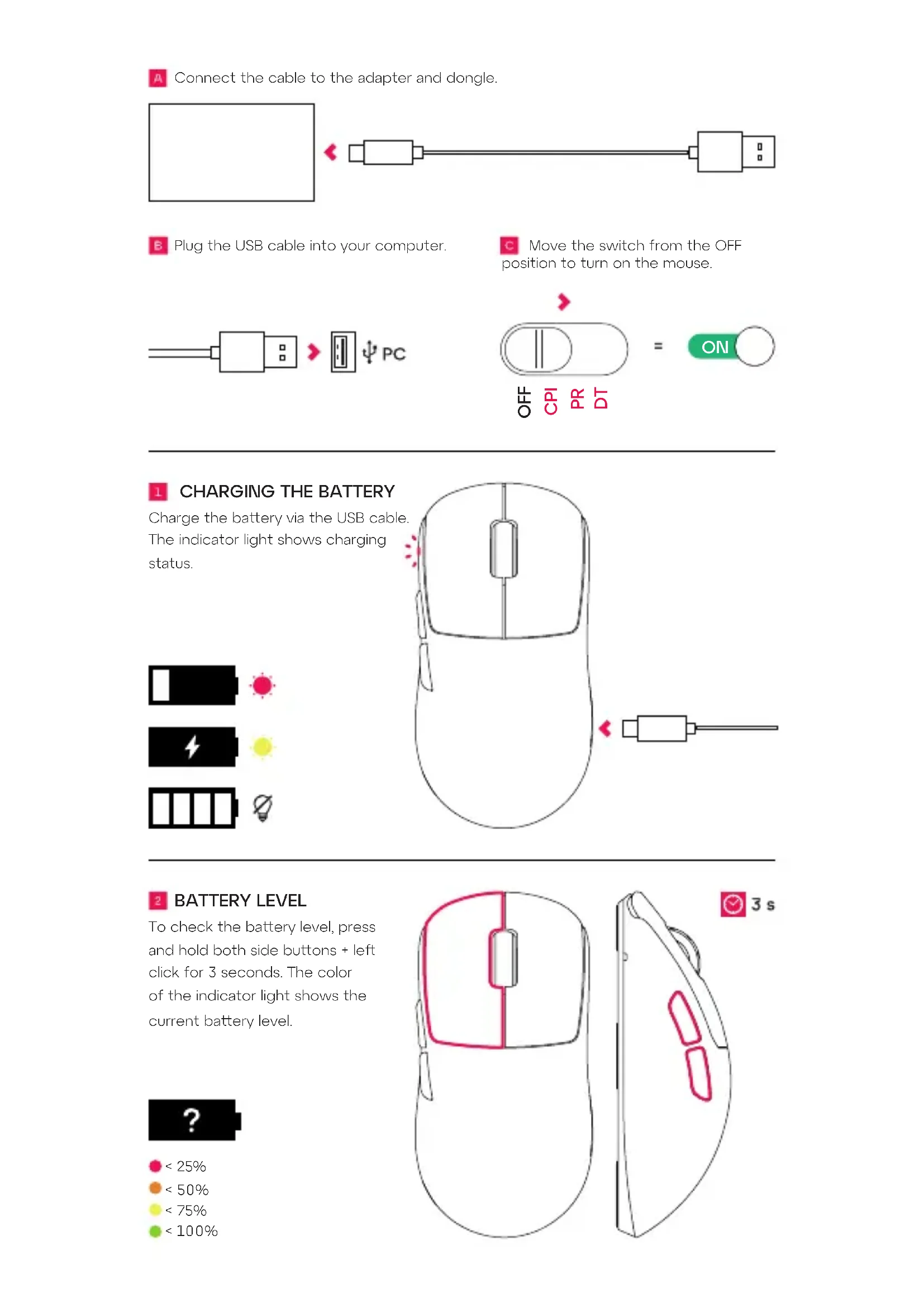 Charge the baery via the USB cable. The indicator light shows charging status. BATTERY LEVEL To check the baery level, press and hold both side buons + le click for 3 seconds. The color of the indicator light shows the current baery level. < 25% < 50% < 75% < 100%CPI (MOUSE SENSITIVITY) Set the switch into CPI mode. Then press the boom buon repeatedly to adjust the mouse sensitivity. The color of the indicator light shows the current seing. POLLING RATE Set the switch into PR mode. Then press the boom buon repeatedly to adjust the polling rate. DEBOUNCE TIME Set the switch into DT mode. Then press the boom buon repeatedly to adjust the debounce time. OFF OFF OFF CPI CPI CPI