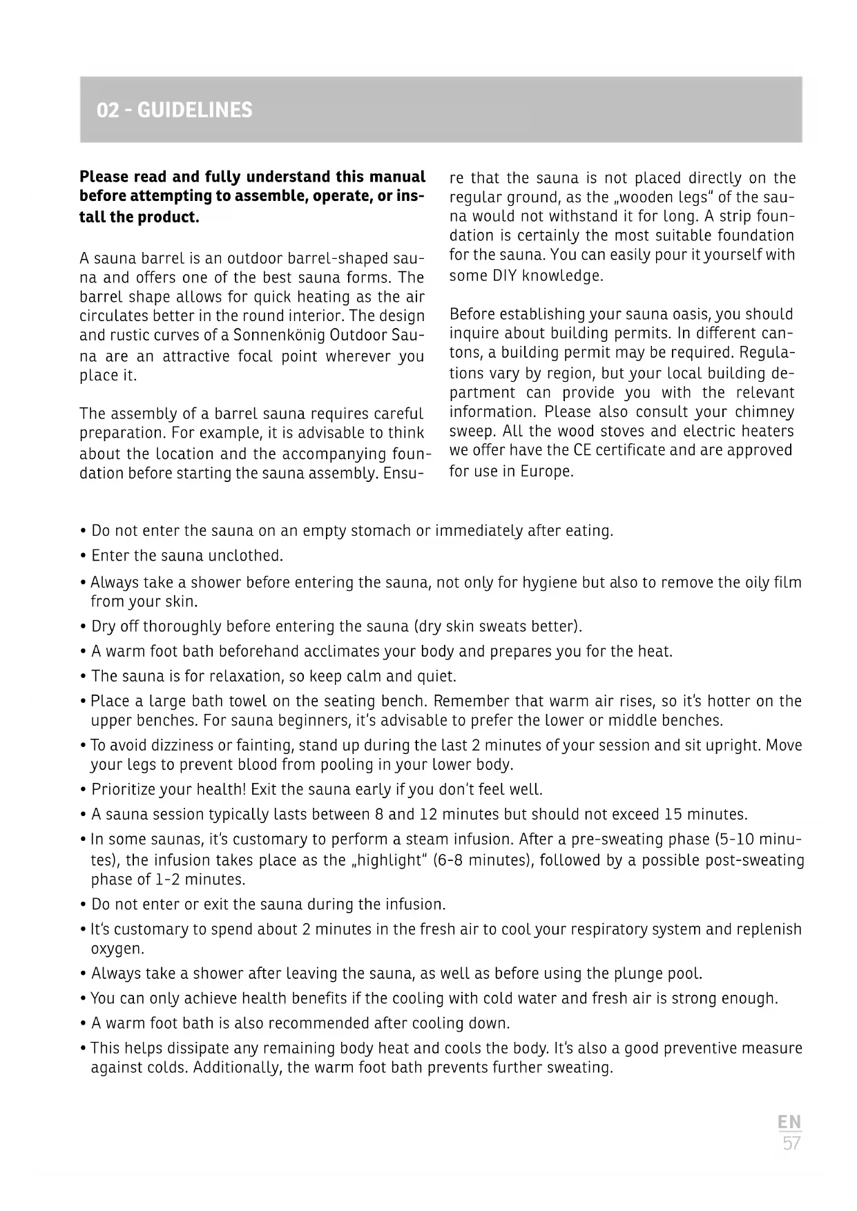 - This helps dissipate any remaining body heat and cools the body. It‘s also a good preventive measure against colds. Additionally, the warm foot bath prevents further sweating. 02 GUIDELINES Please read and fully understand this manual before attempting to assemble, operate, or ins- tall the product. A sauna barrel is an outdoor barrel-shaped sau- na and offers one of the best sauna forms. The barrel shape allows for quick heating as the air circulates better in the round interior. The design and rustic curves of a Sonnenkönig Outdoor Sau- na are an attractive focal point wherever you place it. The assembly of a barrel sauna requires careful preparation. For example, it is advisable to think about the location and the accompanying foun- dation before starting the sauna assembly. Ensu- re that the sauna is not placed directly on the regular ground, as the „wooden legs“ of the sau- na would not withstand it for long. A strip foun- dation is certainly the most suitable foundation for the sauna. You can easily pour it yourself with some DIY knowledge. Before establishing your sauna oasis, you should inquire about building permits. In different can- tons, a building permit may be required. Regula- tions vary by region, but your local building de- partment can provide you with the relevant information. Please also consult your chimney sweep. All the wood stoves and electric heaters we offer have the CE certificate and are approved for use in Europe.EN