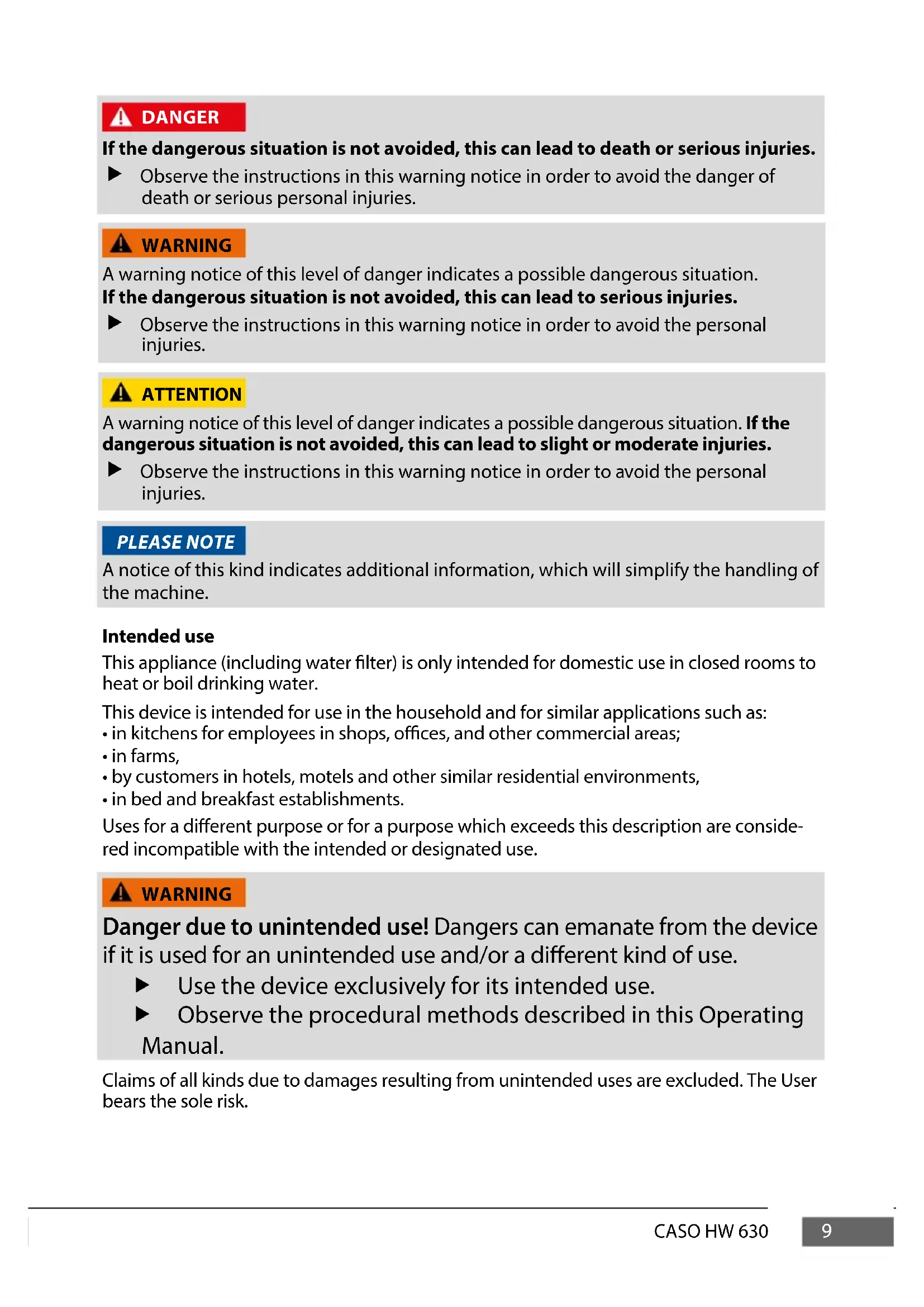 - in bed and breakfast establishments. Uses for a dierent purpose or for a purpose which exceeds this description are conside- red incompatible with the intended or designated use. WARNING Danger due to unintended use! Dangers can emanate from the device if it is used for an unintended use and/or a dierent kind of use. f Use the device exclusively for its intended use. f Observe the procedural methods described in this Operating Manual. Claims of all kinds due to damages resulting from unintended uses are excluded. The User bears the sole risk. WARNING ATTENTION PLEASE NOTE10 CASO HW 630 General Safety information PLEASE NOTE Please observe the following general safety notices with regard to the safe handling of the device. f Use the appliance only as described in the user’s guide to avoid possi- ble injury from misuse. f This device may be used by children aged 8 and above, if they are supervised or have been instructed at to the safe use of the device and have understood the resulting hazards. f Cleaning and maintenance by the user must not be performed by children unless they are at least 8 years old and are supervised. f Children are not allowed to play with the device. f The device and its connecting cable must be kept away from children who are less than 8 years old. f This appliance can be used by persons with reduced physical, senso- ry or mental capabilities or lack of experience and knowledge if they have been given supervision or instruction concerning the use of the appliance safely and they understand the hazards involved. f Operate the appliance only in dry indoor areas. f Do not operate the appliance unattended. f Do not use the appliance:
