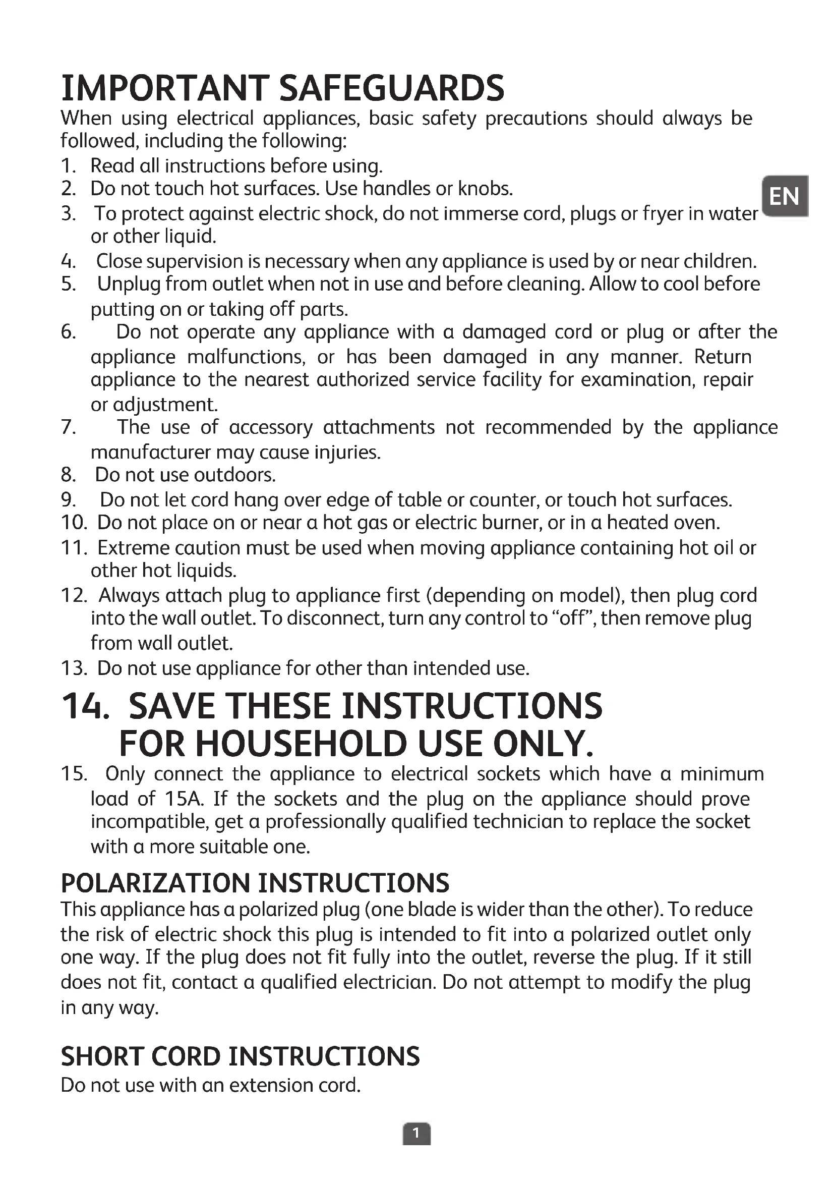 load of 15A. If the sockets and the plug on the appliance should prove incompatible, get a professionally qualified technician to replace the socket with a more suitable one. POLARIZATION INSTRUCTIONS This appliance has a polarized plug (one blade is wider than the other). To reduce the risk of electric shock this plug is intended to fit into a polarized outlet only one way. If the plug does not fit fully into the outlet, reverse the plug. If it still does not fit, contact a qualified electrician. Do not attempt to modify the plug in any way.