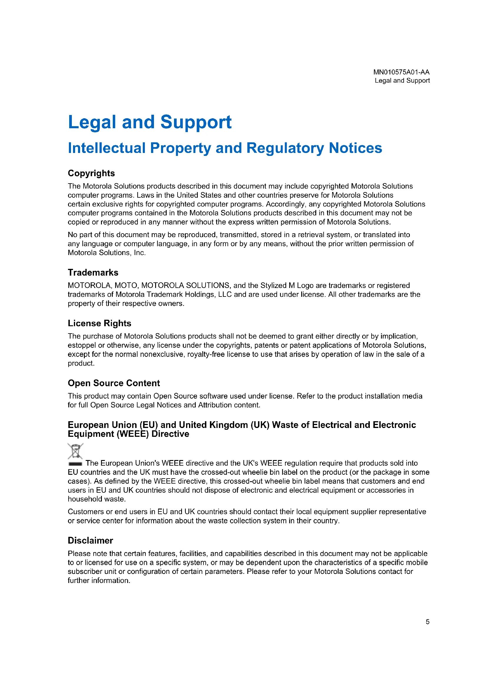 MN010575A01-AA Contents 4Legal and Support Intellectual Property and Regulatory Notices Copyrights The Motorola Solutions products described in this document may include copyrighted Motorola Solutions computer programs. Laws in the United States and other countries preserve for Motorola Solutions certain exclusive rights for copyrighted computer programs. Accordingly, any copyrighted Motorola Solutions computer programs contained in the Motorola Solutions products described in this document may not be copied or reproduced in any manner without the express written permission of Motorola Solutions. No part of this document may be reproduced, transmitted, stored in a retrieval system, or translated into any language or computer language, in any form or by any means, without the prior written permission of Motorola Solutions, Inc. Trademarks MOTOROLA, MOTO, MOTOROLA SOLUTIONS, and the Stylized M Logo are trademarks or registered trademarks of Motorola Trademark Holdings, LLC and are used under license. All other trademarks are the property of their respective owners. License Rights The purchase of Motorola Solutions products shall not be deemed to grant either directly or by implication, estoppel or otherwise, any license under the copyrights, patents or patent applications of Motorola Solutions, except for the normal nonexclusive, royalty-free license to use that arises by operation of law in the sale of a product. Open Source Content This product may contain Open Source software used under license. Refer to the product installation media for full Open Source Legal Notices and Attribution content. European Union (EU) and United Kingdom (UK) Waste of Electrical and Electronic Equipment (WEEE) Directive The European Union's WEEE directive and the UK's WEEE regulation require that products sold into EU countries and the UK must have the crossed-out wheelie bin label on the product (or the package in some cases). As defined by the WEEE directive, this crossed-out wheelie bin label means that customers and end users in EU and UK countries should not dispose of electronic and electrical equipment or accessories in household waste. Customers or end users in EU and UK countries should contact their local equipment supplier representative or service center for information about the waste collection system in their country. Disclaimer Please note that certain features, facilities, and capabilities described in this document may not be applicable to or licensed for use on a specific system, or may be dependent upon the characteristics of a specific mobile subscriber unit or configuration of certain parameters. Please refer to your Motorola Solutions contact for further information. MN010575A01-AA Legal and Support