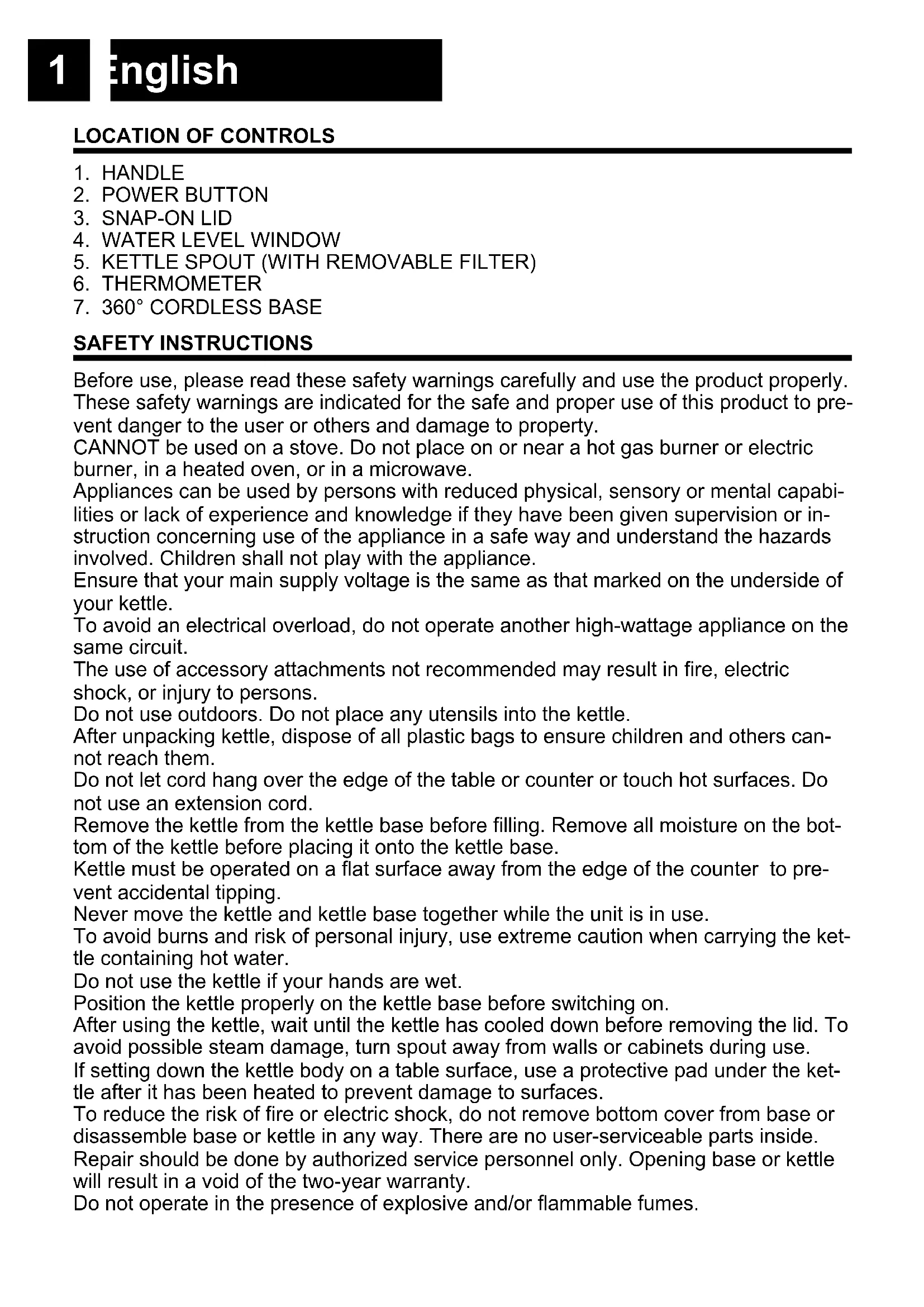 SAFETY INSTRUCTIONS Before use, please read these safety warnings carefully and use the product properly. These safety warnings are indicated for the safe and proper use of this product to pre- vent danger to the user or others and damage to property. CANNOT be used on a stove. Do not place on or near a hot gas burner or electric burner, in a heated oven, or in a microwave. Appliances can be used by persons with reduced physical, sensory or mental capabi- lities or lack of experience and knowledge if they have been given supervision or in- struction concerning use of the appliance in a safe way and understand the hazards involved. Children shall not play with the appliance. Ensure that your main supply voltage is the same as that marked on the underside of your kettle. To avoid an electrical overload, do not operate another high-wattage appliance on the same circuit. The use of accessory attachments not recommended may result in fire, electric shock, or injury to persons. Do not use outdoors. Do not place any utensils into the kettle. After unpacking kettle, dispose of all plastic bags to ensure children and others can- not reach them. Do not let cord hang over the edge of the table or counter or touch hot surfaces. Do not use an extension cord. Remove the kettle from the kettle base before filling. Remove all moisture on the bot- tom of the kettle before placing it onto the kettle base. Kettle must be operated on a flat surface away from the edge of the counter to pre- vent accidental tipping. Never move the kettle and kettle base together while the unit is in use. To avoid burns and risk of personal injury, use extreme caution when carrying the ket- tle containing hot water. Do not use the kettle if your hands are wet. Position the kettle properly on the kettle base before switching on. After using the kettle, wait until the kettle has cooled down before removing the lid. To avoid possible steam damage, turn spout away from walls or cabinets during use. If setting down the kettle body on a table surface, use a protective pad under the ket- tle after it has been heated to prevent damage to surfaces. To reduce the risk of fire or electric shock, do not remove bottom cover from base or disassemble base or kettle in any way. There are no user-serviceable parts inside. Repair should be done by authorized service personnel only. Opening base or kettle will result in a void of the two-year warranty. Do not operate in the presence of explosive and/or flammable fumes.2 English Do not use the kettle for other than intended use. This appliance is intended for household use only. POWER SOURCES You can power Kettle by plugging the AC power cord into the AC plug into a wall AC power outlet. Check that the rated voltage of your appliance matches your local voltage. Make sure that the AC power cord is fully inserted into the appliance.