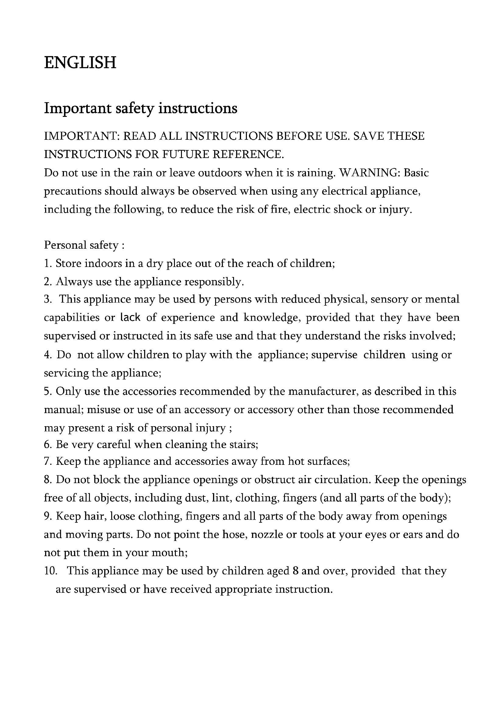Do not use near flames Do not store near heat sources Keep your hands away from the roller when the appliance is in use. Do not suck up water or liquids Do not inhale burning objects SAFETY INSTRUCTIONS