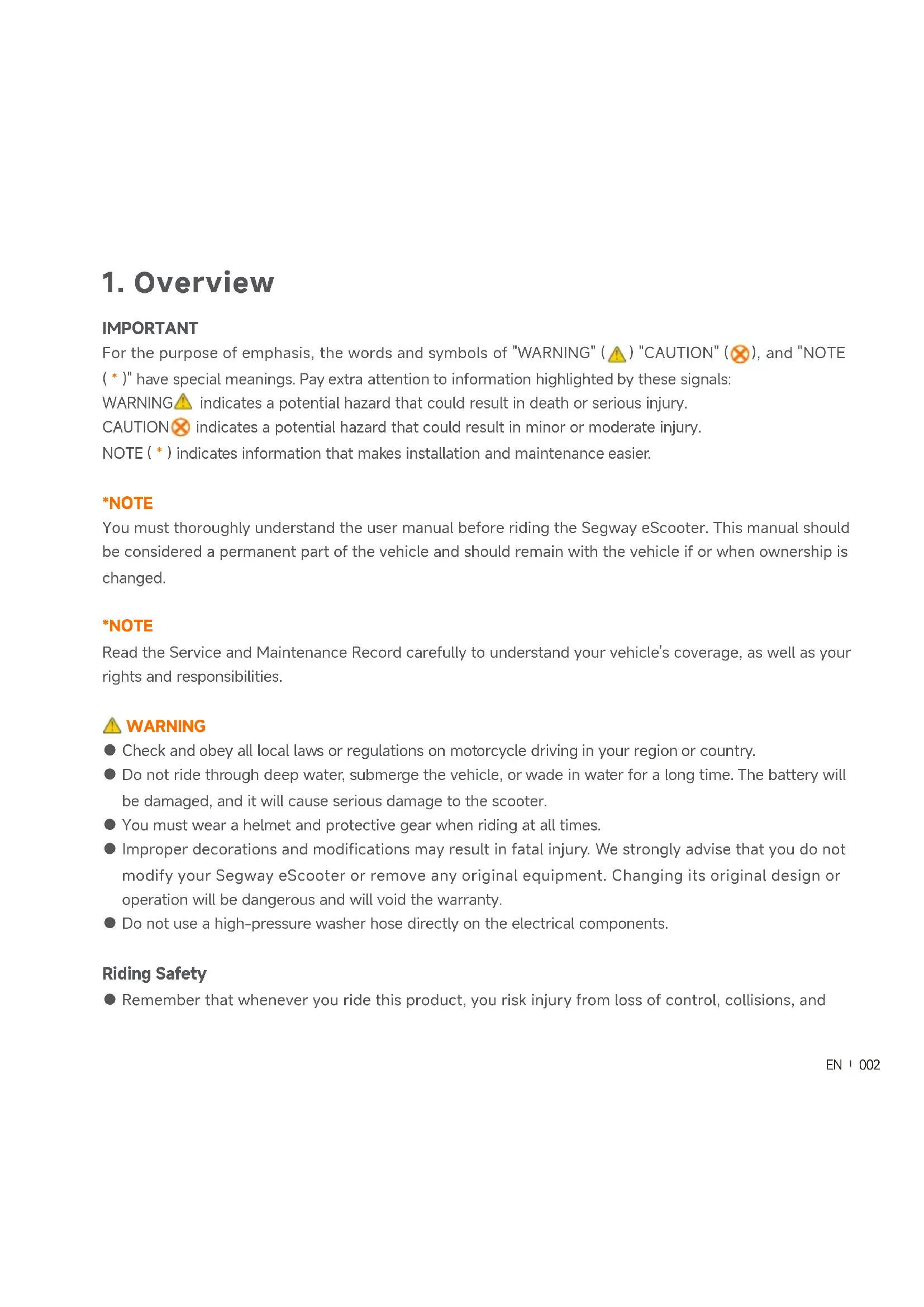 IMPORTANT For the purpose of emphasis, the words and symbols of "WARNING" ( ) "CAUTION" ( ), and "NOTE ( * )" have special meanings. Pay extra attention to information highlighted by these signals: WARNING indicates a potential hazard that could result in death or serious injury. CAUTION indicates a potential hazard that could result in minor or moderate injury. NOTE ( * ) indicates information that makes installation and maintenance easier. *NOTE You must thoroughly understand the user manual before riding the Segway eScooter. This manual should be considered a permanent part of the vehicle and should remain with the vehicle if or when ownership is changed. *NOTE Read the Service and Maintenance Record carefully to understand your vehicle's coverage, as well as your rights and responsibilities. WARNING ● Check and obey all local laws or regulations on motorcycle driving in your region or country. ● Do not ride through deep water, submerge the vehicle, or wade in water for a long time. The battery will be damaged, and it will cause serious damage to the scooter. ● You must wear a helmet and protective gear when riding at all times. ● Improper decorations and modifications may result in fatal injury. We strongly advise that you do not modify your Segway eScooter or remove any original equipment. Changing its original design or operation will be dangerous and will void the warranty. ● Do not use a high-pressure washer hose directly on the electrical components. Riding Safety ● Remember that whenever you ride this product, you risk injury from loss of control, collisions, and