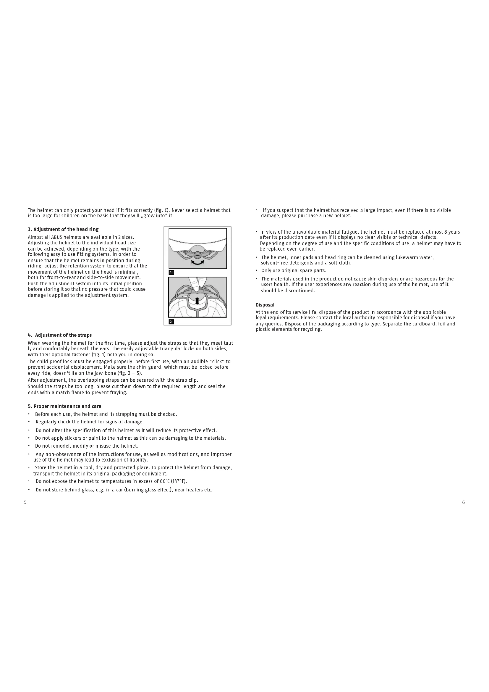 When wearing the helmet for the rst time, please adjust the straps so that they meet taut- ly and comfortably beneath the ears. The easily adjustable triangular locks on both sides, with their optional fastener (g. 1) help you in doing so. The child proof lock must be engaged properly, before rst use, with an audible “click” to prevent accidental displacement. Make sure the chin-guard, which must be locked before every ride, doesn’t lie on the jaw-bone (g. 2 – 5). Aer adjustment, the overlapping straps can be secured with the strap clip. Should the straps be too long, please cut them down to the required length and seal the ends with a match ame to prevent fraying.