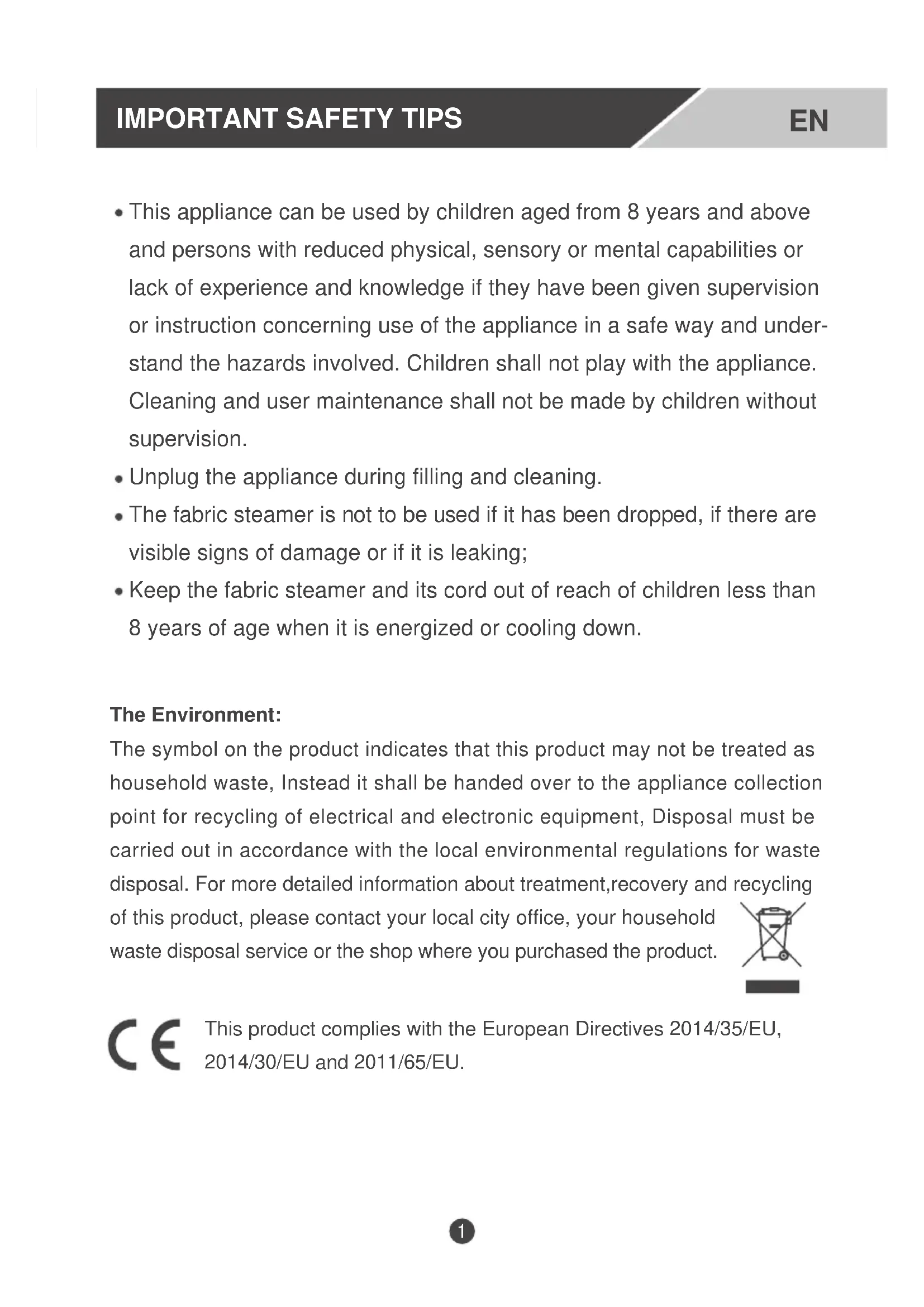 The Environment: The symbol on the product indicates that this product may not be treated as household waste, Instead it shall be handed over to the appliance collection point for recycling of electrical and electronic equipment, Disposal must be carried out in accordance with the local environmental regulations for waste disposal. For more detailed information about treatment,recovery and recycling of this product, please contact your local city office, your household waste disposal service or the shop where you purchased the product. This product complies with the European Directives 2014/35/EU, 2014/30/EU and 2011/65/EU.EN The mini body with folding design, which is more convenient to carry. This product can be used flat or hanging, wet or dry, making it easy to care for all types of clothing. Operation and control in one click for continuous steam output, which is safe and convenient. The transparent separated water tank is easy to fill water, which is simple and beautiful. The panel is stainless steel, which makes the steam come out more evenly and smoothly, and it does not hurt clothing, saves ironing time. The panel is drip-proof for more comfortable use. It can automatically cut off the power, stop for 8min and turn off auto- matically when unattended, which is safer. The shutdown protection will be carried out in case of water shortage to prolong the use of the product. PRODUCT INTRODUCTION 2EN