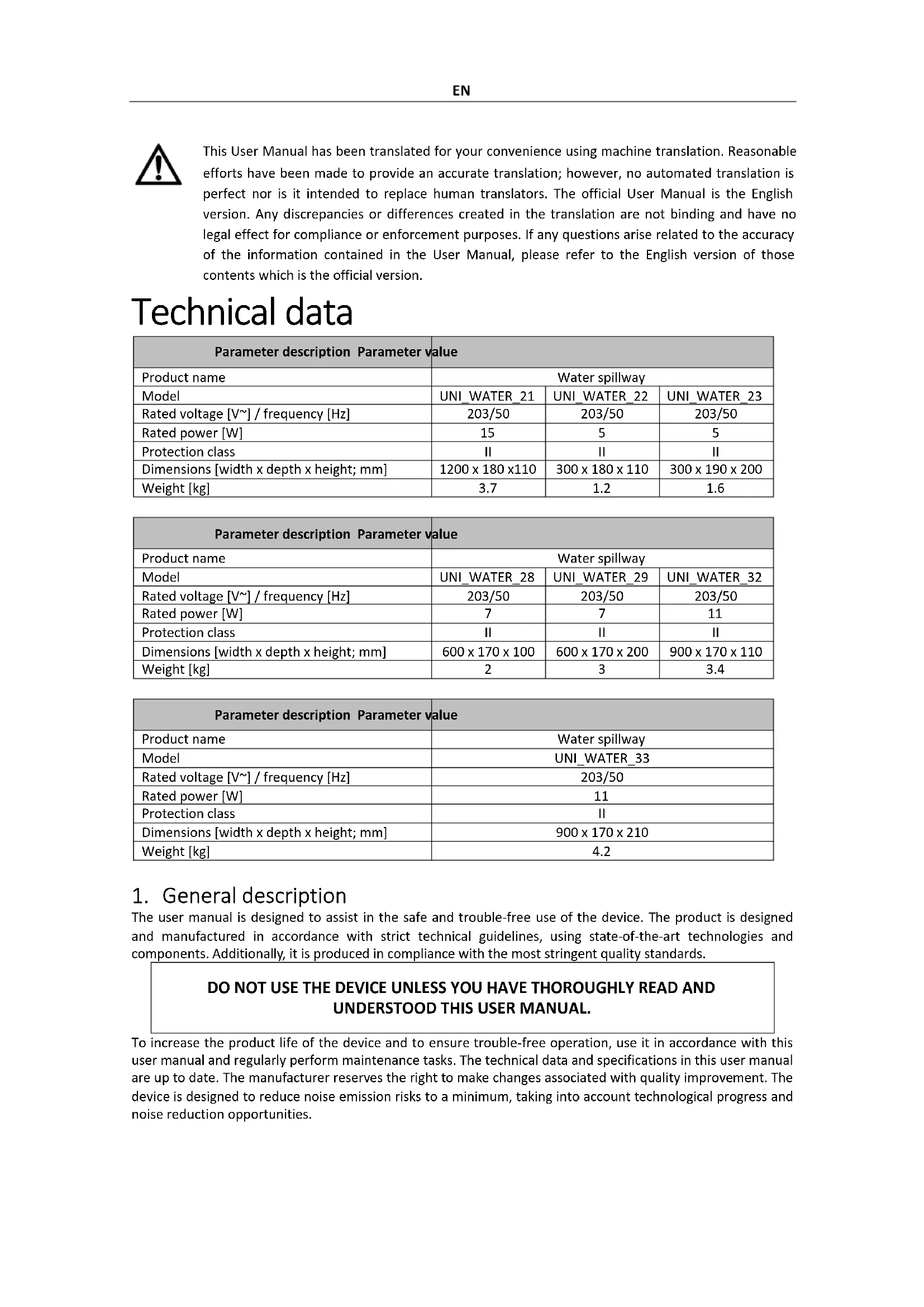 ATTENTION! Read all safety warnings and all instructions. Failure to follow the warnings and instructions may result in electric shock, fire and/or serious injury or even death. The terms "device" or "product" are used in the warnings and instructions to refer to: Water spillway 2.1. Electrical safety Applies to the power supply a) The plug must fit the socket. Do not modify the plug in any way. Using original plugs and matching sockets reduces the risk of electric shock. b) Do not touch the device with wet or damp hands. c) Use the cable only for its designated use. Never use it to carry the device or to pull the plug out of a socket. Keep the cable away from heat sources, oil, sharp edges or moving parts. Damaged or tangled cables increase the risk of electric shock. d) If working with the device outdoors, make sure to use an extension cord suitable for outdoor use. Using an extension cord suitable for outdoor use reduces the risk of electric shock. e) If using the device in a damp environment cannot be avoided, a residual current device (RCD) should be applied. The use of an RCD reduces the risk of electric shock. 2.2. Safety in the workplace a) Make sure the workplace is clean and well lit. A messy or poorly lit workplace may lead to accidents. Try to think ahead, observe what is going on and use common sense when working with the device. b) If you discover damage or irregular operation, immediately switch the device off and report it to a supervisor without delay. c) If there are any doubts as to the correct operation of the device, contact the manufacturer's support service. d) Only the manufacturer's service point may repair the device. Do not attempt any repairs independently! e) In case of fire, use a powder or carbon dioxide (CO2) fire extinguisher (one intended for use on live electrical devices) to put it out. f) Regularly inspect the condition of the safety labels. If the labels are illegible, they must be replaced. g) Please keep this manual available for future reference. If this device is passed on to a third party, the manual must be passed on with it.EN