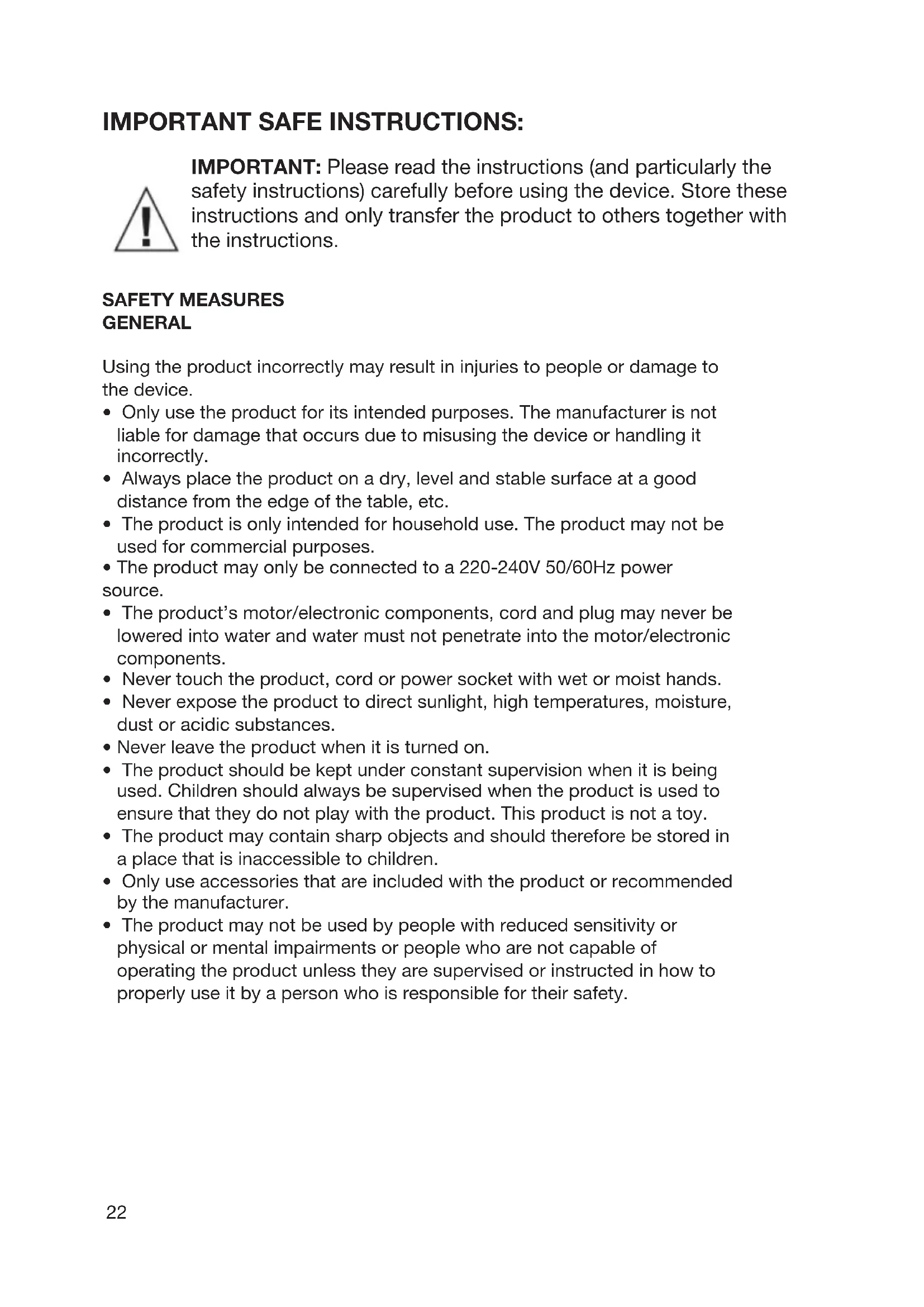 IMPORTANT SAFE INSTRUCTIONS: IMPORTANT: Please read the instructions (and particularly the safety instructions) carefully before using the device. Store these instructions and only transfer the product to others together with the instructions. SAFETY MEASURES GENERAL Using the product incorrectly may result in injuries to people or damage to the device.