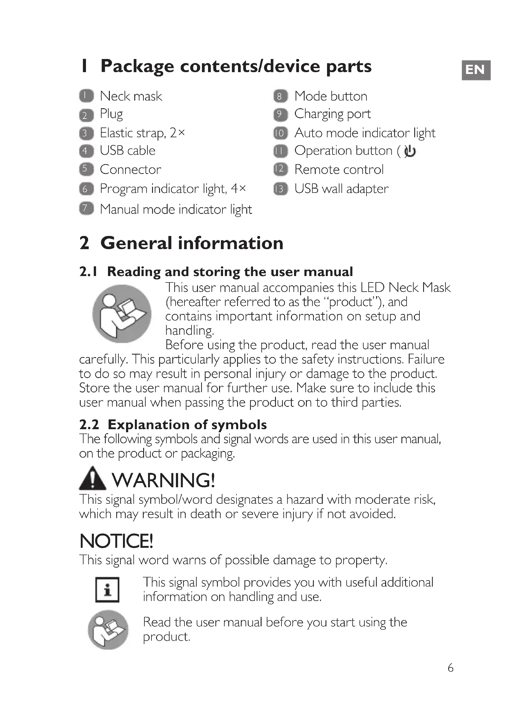 This user manual accompanies this LED Neck Mask (hereafter referred to as the “product”), and contains important information on setup and handling. Before using the product, read the user manual carefully. This particularly applies to the safety instructions. Failure to do so may result in personal injury or damage to the product. Store the user manual for further use. Make sure to include this user manual when passing the product on to third parties.