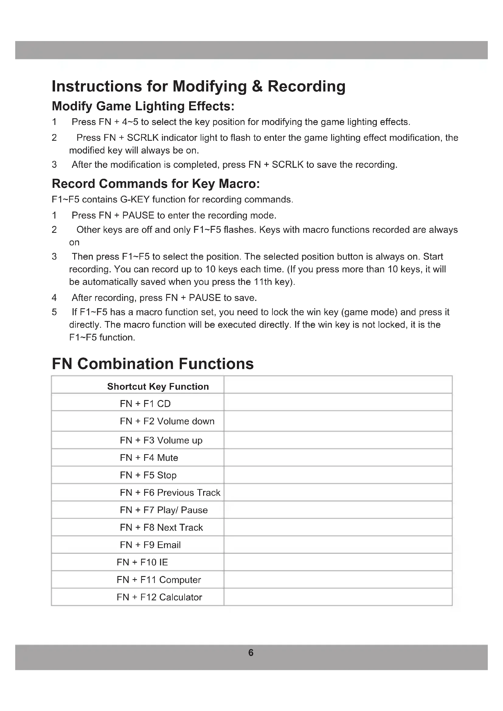 01 English Product Overview 1 Magnetic upper cover 2 Indicator light 3 Knob 4 Stand 5 Footpad 6 Side light bar4 5 Groups of Built-in Game Lighting Effects Please note that the black dots indicating lighting effects are for reference only. 1 Game Mode 1 (FN + 1), Light on : W, A, S, D,↑ ,↓ , ←, → 2 Game Mode 2 (FN + 2), Light on : ESC, 1, 2, 3, 4, 5, TAB, Q, W, E, R, A, S, D, F, G, SHIFT-L, CTRL-L, Space4 5 3 Game Mode 3 (FN + 3), Light on : ESC, ~, 1, 2, 3, 4, 5, TAB, Q, W, E, P, A, S, D, F, G, V, B, CTRL-L, Space 4 Game Mode 4 (FN + 4) (by default), Light on : W, A, S, D,↑ ,↓ , ←, → 5 Game Mode 5 (FN + 5) (by default), Light on : W, A, S, D,↑ ,↓ , ←, →6 Instructions for Modifying & Recording Modify Game Lighting Effects: 1 Press FN + 4~5 to select the key position for modifying the game lighting effects. 2 Press FN + SCRLK indicator light to flash to enter the game lighting effect modification, the modified key will always be on. 3 After the modification is completed, press FN + SCRLK to save the recording. Record Commands for Key Macro: F1~F5 contains G-KEY function for recording commands. 1 Press FN + PAUSE to enter the recording mode. 2 Other keys are off and only F1~F5 flashes. Keys with macro functions recorded are always