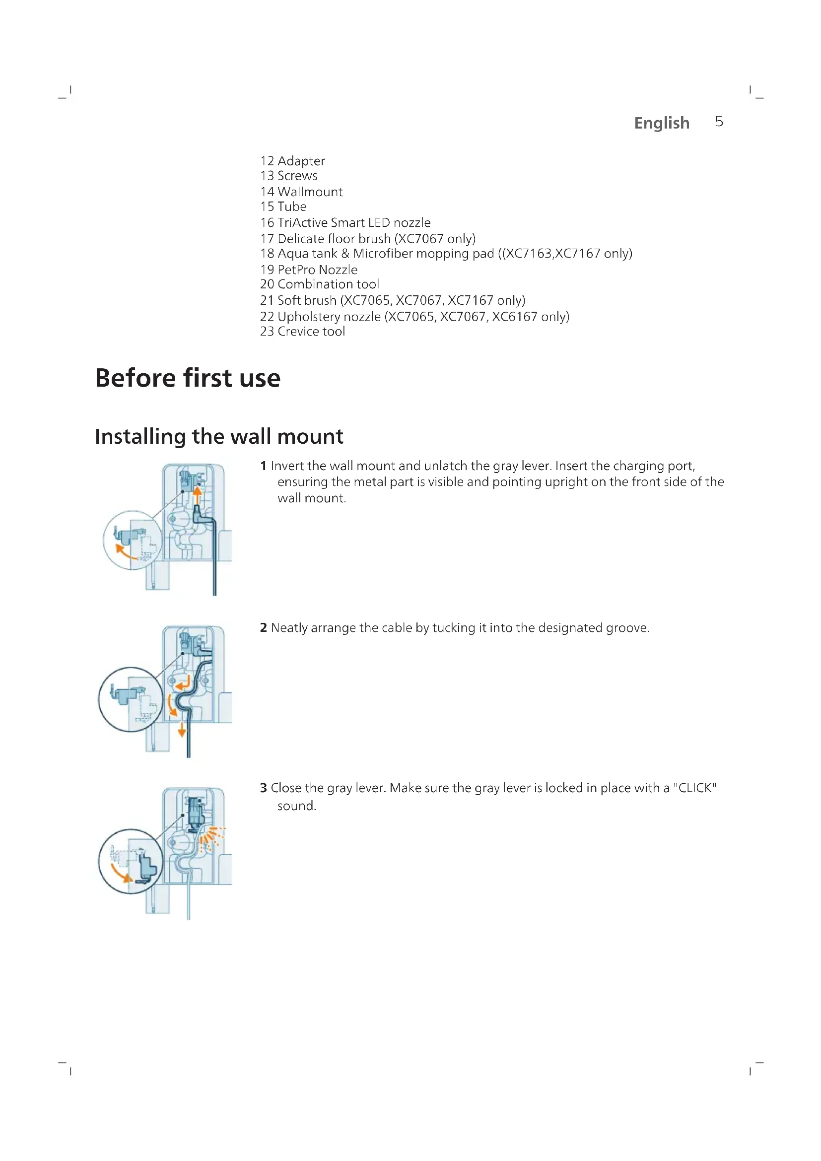 English English Contents Introduction ______________________________________________________________________________ 4 General description _______________________________________________________________________ 4 Before first use____________________________________________________________________________ 5 Installing the wall mount ________________________________________________________________ 5 Storing the accessories on the wall mount _________________________________________________ 6 Preparing for use__________________________________________________________________________ 7 Using the appliance _______________________________________________________________________ 8 Assembling the appliance________________________________________________________________ 8 Vacuuming soft and hard floors __________________________________________________________ 8 Vacuuming while mopping hard floors ____________________________________________________ 9 Versatile usage and accessories___________________________________________________________ 12 Customizations and additional information ________________________________________________ 16 After use – Maintenance ___________________________________________________________________ 18 Frequent maintenance after each cleaning cycle ____________________________________________ 18 Periodic maintenance intermittently ______________________________________________________ 21 Replacement______________________________________________________________________________ 30 User interface signals and their meaning____________________________________________________ 31 Troubleshooting __________________________________________________________________________ 33 Dry cleaning ___________________________________________________________________________ 33 Wet cleaning___________________________________________________________________________ 37 Introduction Thank you for buying this product! To fully benefit from the support that we offer, register your product at www.philips.com/mycordlessvacuum-7000s. General description 1 Digital display a Ring indicator of battery level b Percentage of battery level c Selected power level d 'Floor Type Recognition feature activated' icon e Filter cleaning reminder icon 2 Menu/Confirm button 3 + Button 4 – Button 5 On/off button 6 Handheld 7 Dust bucket 8 Battery 9 Replacement filter 10 Easy empty button 11 Dust bucket release button5 English 12 Adapter 13 Screws 14 Wallmount 15 Tube 16 TriActive Smart LED nozzle 17 Delicate floor brush (XC7067 only) 18 Aqua tank & Microfiber mopping pad ((XC7163,XC7167 only) 19 PetPro Nozzle 20 Combination tool 21 Soft brush (XC7065, XC7067, XC7167 only) 22 Upholstery nozzle (XC7065, XC7067, XC6167 only) 23 Crevice tool Before first use Installing the wall mount 1 Invert the wall mount and unlatch the gray lever. Insert the charging port, ensuring the metal part is visible and pointing upright on the front side of the wall mount. 2 Neatly arrange the cable by tucking it into the designated groove. 3 Close the gray lever. Make sure the gray lever is locked in place with a "CLICK" sound.6 English 110 ± 2 cm 4 Securely affix the wall mount to your preferred position on the wall, ensuring that the mounting screw holes are approximately 110 cm from the floor. Caution: Be careful when you drill holes in the wall to fasten the wall mount, to avoid the risk of electric shock. Note: Verify that the placement of the wall mount allows the entire appliance to hang on the wall without the nozzle coming into contact with the floor. 5 Once you have determined the optimal position and height for storing and charging your appliance, firmly tighten the screws to secure the wall mount in place. Storing the accessories on the wall mount All accessories can be stored on the wallmount with exception of combining PetPro Nozzle & Upholstery tool. Note: Be cautious that the PetPro Nozzle and the Upholstery tool could not be stored on the wall mount together.7 English Preparing for use The appliance is equipped with a Li-Ion battery. Charging from empty to full takes about 6 hours. 1 Attach the battery pack to the main body of the appliance, ensuring a secure connection that's confirmed with a "CLICK" sound.