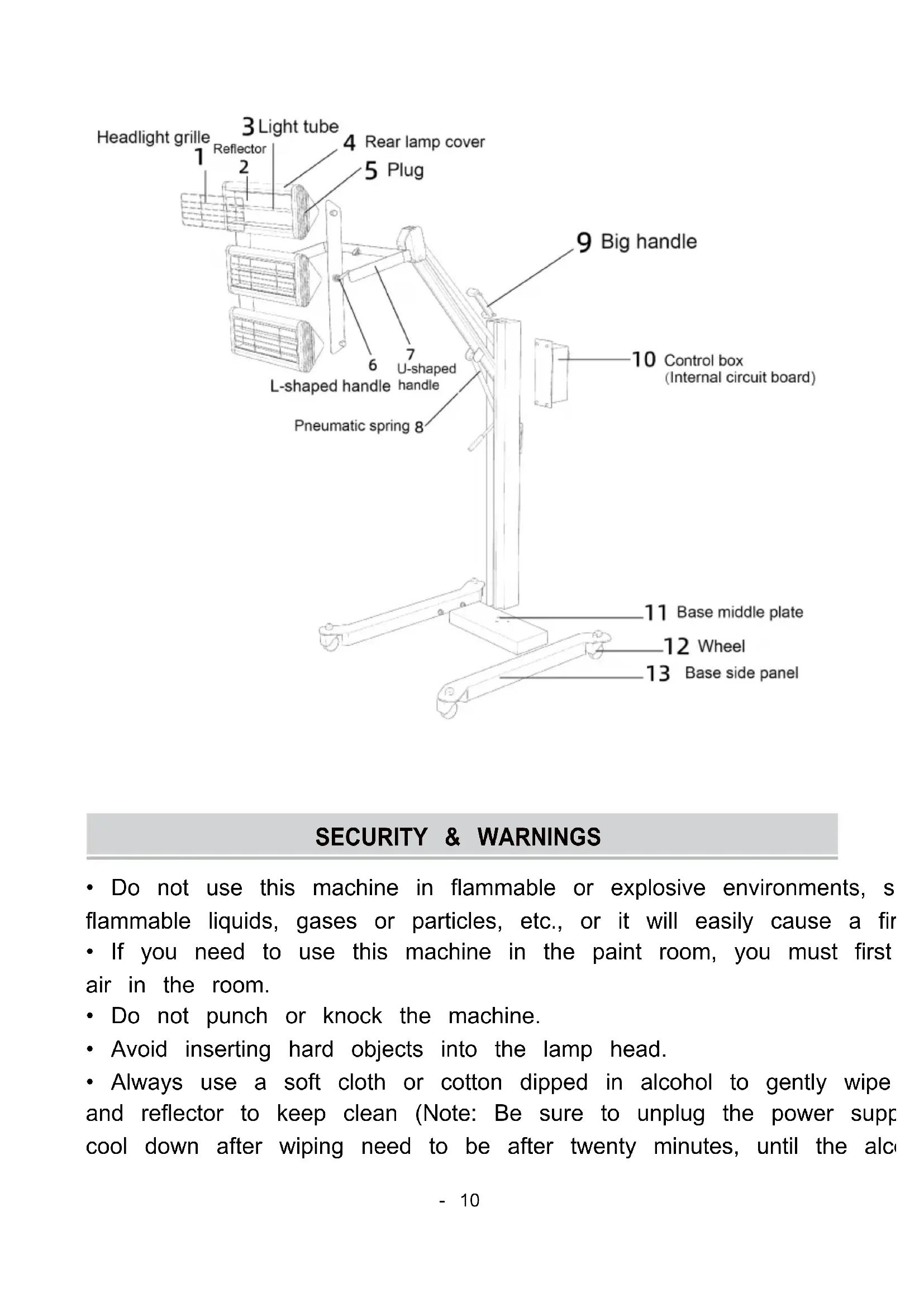 Box A: 1 set of Lamp holders (Including 3 Lamp tubes assembled into one); Box B: 1 set of Column Control System 1 set of Base Adjustable handles *3 (With 2 Washers and 1 Screw) Inner hexagonal corners*2 Casters*4 (2 brakes / 2 movable) Handle*2- 5 -- 6 -- 7 -- 8 -- 9 -- 10 - SECURITY & WARNINGS
