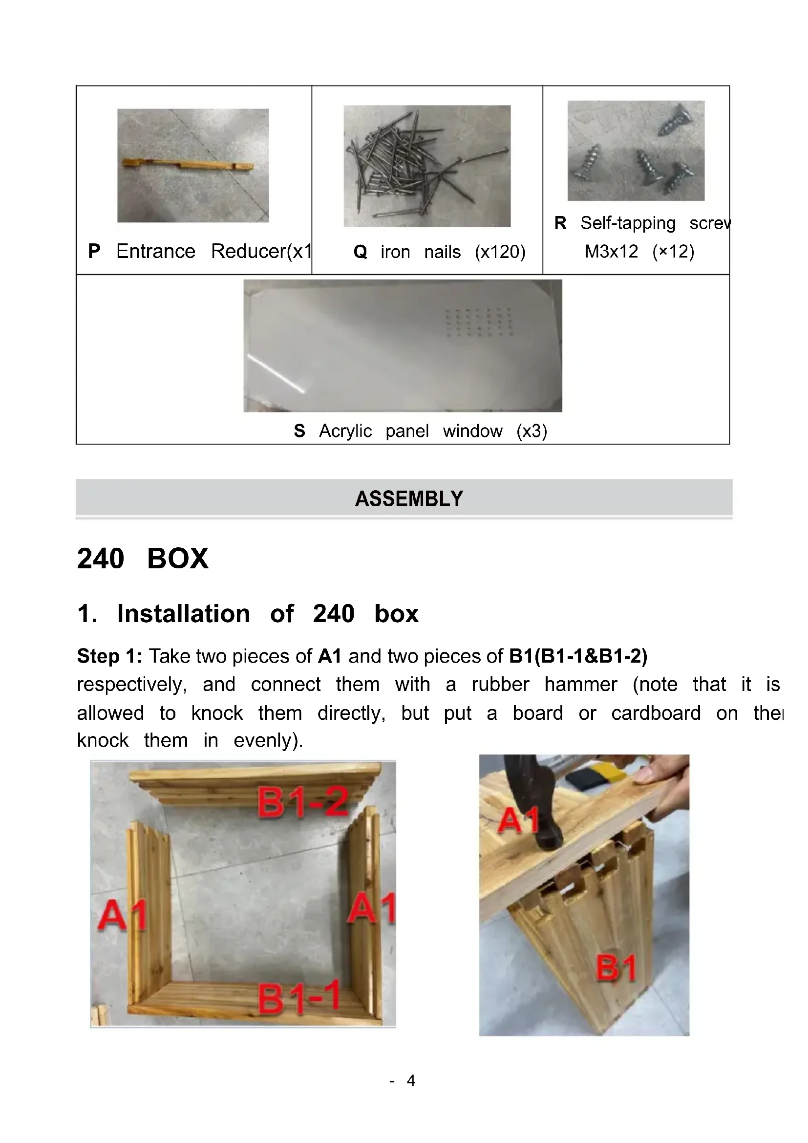 I-1 I-2 I Window pane (×3) J Self-tapping screw M4x20 (×6) K Small plank (×6) L Top Cover (×1) M Inner Cover (×1) N Bottom Board(x1) O Queen Excluder (x1)- 4 - P Entrance Reducer(x1) Q iron nails (x120) R Self-tapping screw M3x12 (×12) S Acrylic panel window (x3) ASSEMBLY 240 BOX