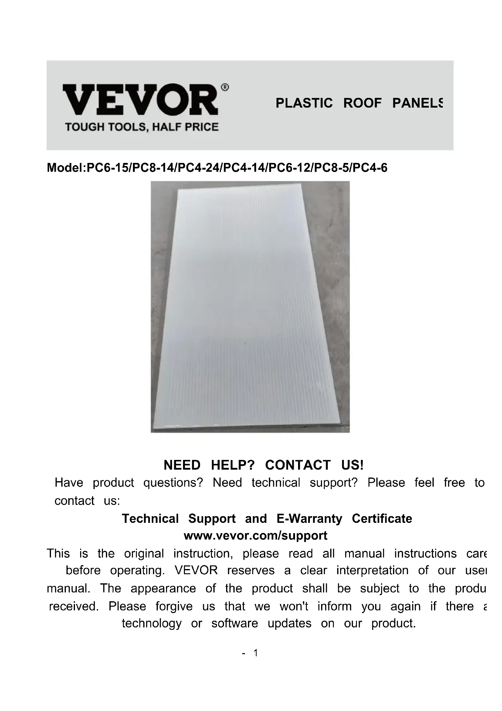 MODEL:PC6-15/PC8-14/PC4-24/PC4-14/PC6-12/PC8-5/PC4-6 We continue to be committed to provide you tools with competitive price. "Save Half", "Half Price" or any other similar expressions used by us only represents an estimate of savings you might benefit from buying certain tools with us compared to the major top brands and does not necessarily mean to cover all categories of tools offered by us. You are kindly reminded to verify carefully when you are placing an order with us if you are actually Saving Half in comparison with the top major brands.- 1 - Model:PC6-15/PC8-14/PC4-24/PC4-14/PC6-12/PC8-5/PC4-6 NEED HELP? CONTACT US! Have product questions? Need technical support? Please feel free to contact us: Technical Support and E-Warranty Certificate www.vevor.com/support This is the original instruction, please read all manual instructions carefully before operating. VEVOR reserves a clear interpretation of our user manual. The appearance of the product shall be subject to the product you received. Please forgive us that we won't inform you again if there are any technology or software updates on our product.