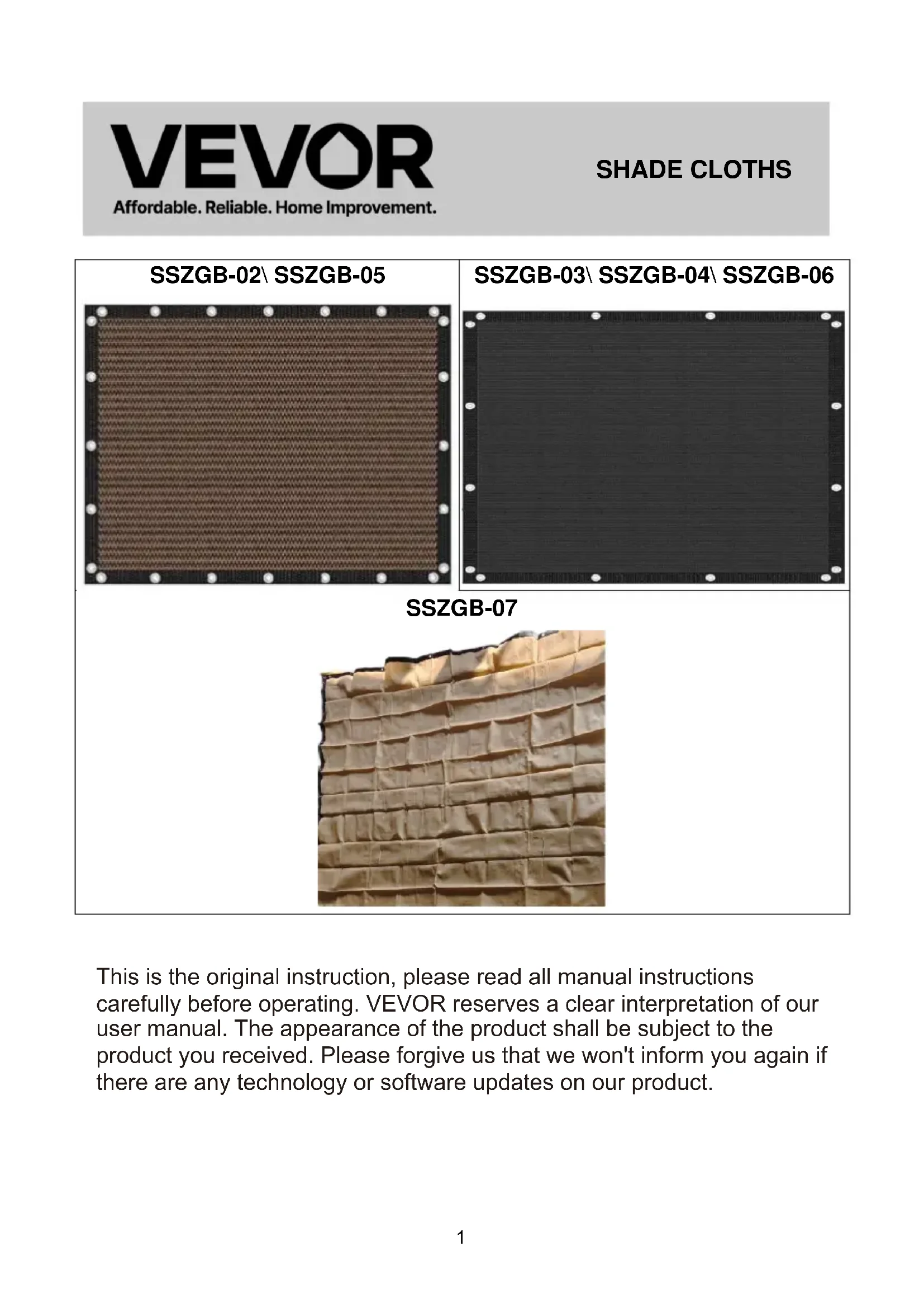 This is the original instruction, please read all manual instructions carefully before operating. VEVOR reserves a clear interpretation of our user manual. The appearance of the product shall be subject to the product you received. Please forgive us that we won't inform you again if there are any technology or software updates on our product. SHADE CLOTHS2