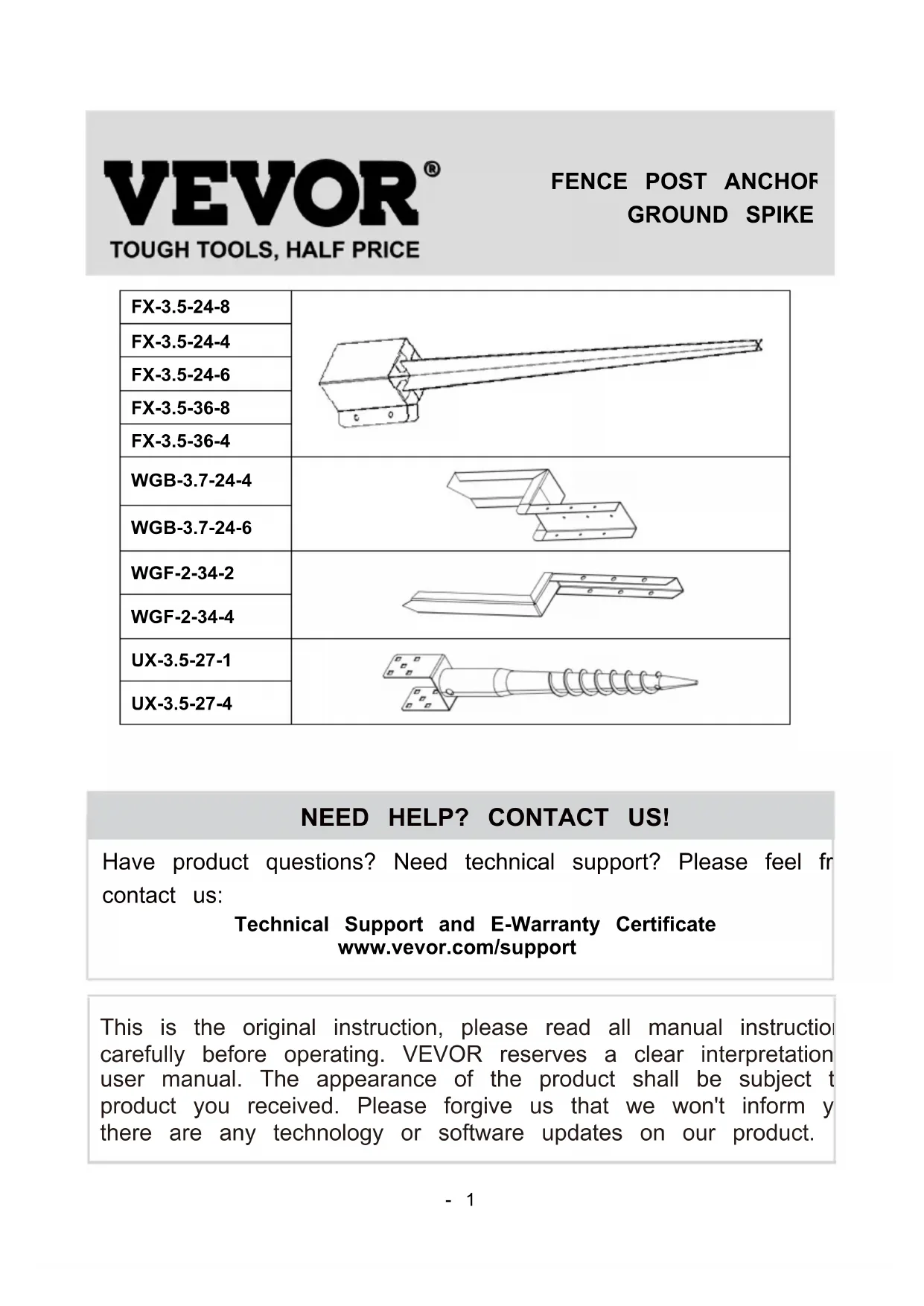 UX-3.5-27-1 UX-3.5-27-4 Have product questions? Need technical support? Please feel free to contact us: Technical Support and E-Warranty Certificate www.vevor.com/support NEED HELP? CONTACT US! This is the original instruction, please read all manual instructions carefully before operating. VEVOR reserves a clear interpretation of our user manual. The appearance of the product shall be subject to the product you received. Please forgive us that we won't inform you again if there are any technology or software updates on our product.