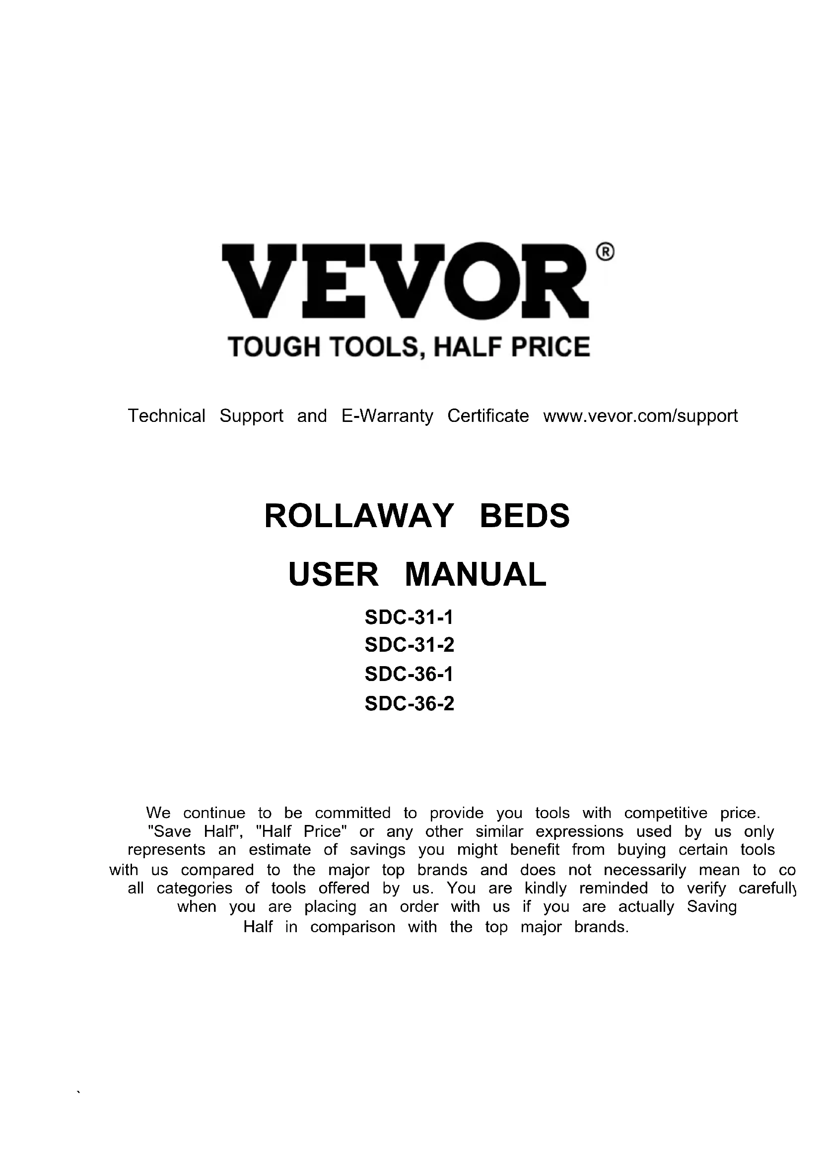 Technical Support and E-Warranty Certificate www.vevor.com/support ROLLAWAY BEDS USER MANUAL SDC-31-1 SDC-31-2 SDC-36-1 SDC-36-2 We continue to be committed to provide you tools with competitive price. "Save Half", "Half Price" or any other similar expressions used by us only represents an estimate of savings you might benefit from buying certain tools with us compared to the major top brands and does not necessarily mean to cover all categories of tools offered by us. You are kindly reminded to verify carefully when you are placing an order with us if you are actually Saving Half in comparison with the top major brands.1 MODEL:SDC-31-1 SDC-31-2 SDC-36-1 SDC-36-2 NEED HELP? CONTACT US! Have product questions? Need technical support? Please feel free to contact us: Technical Support and E-Warranty Certificate www.vevor.com/support This is the original instruction, please read all manual instructions carefully before operating. VEVOR reserves a clear interpretation of our user manual. The appearance of the product shall be subject to the product you received. Please forgive us that we won't inform you again if there are any technology or software updates on our product. ROLLAWAY BEDS2 SAFETY INSTRUCTIONS
