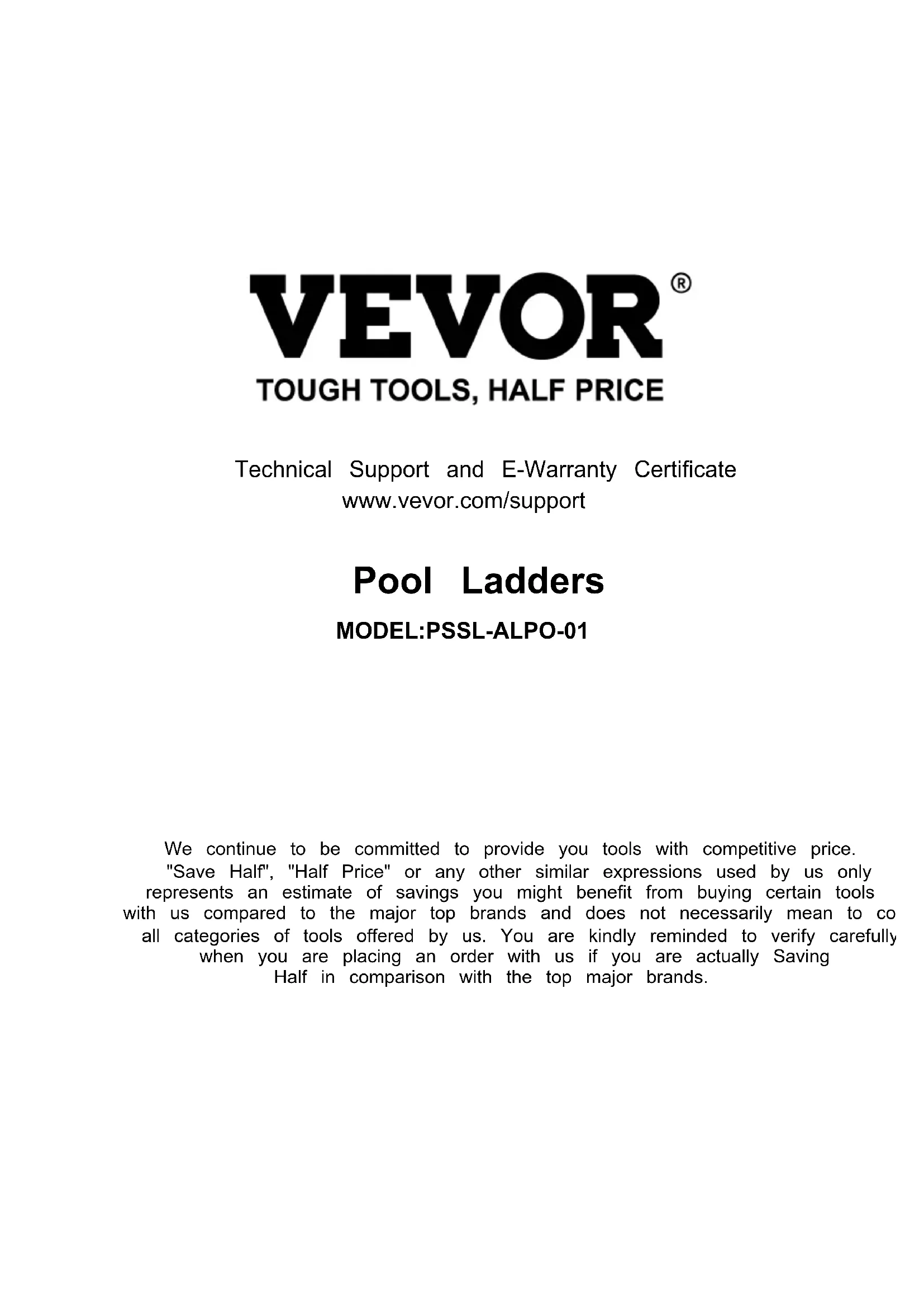 Technical Support and E-Warranty Certificate www.vevor.com/support Pool Ladders MODEL:PSSL-ALPO-01 We continue to be committed to provide you tools with competitive price. "Save Half", "Half Price" or any other similar expressions used by us only represents an estimate of savings you might benefit from buying certain tools with us compared to the major top brands and does not necessarily mean to cover all categories of tools offered by us. You are kindly reminded to verify carefully when you are placing an order with us if you are actually Saving Half in comparison with the top major brands.- 1 - MODEL: PSSL-ALPO-01 NEED HELP? CONTACT US! Have product questions? Need technical support? Please feel free to contact us: Technical Support and E-Warranty Certificate www.vevor.com/support This is the original instruction, please read all manual instructions carefully before operating. VEVOR reserves a clear interpretation of our user manual. The appearance of the product shall be subject to the product you received. Please forgive us that we won't inform you again if there are any technology or software updates on our product. Pool Ladders- 2 - SAFETY INSTRUCTIONS:
