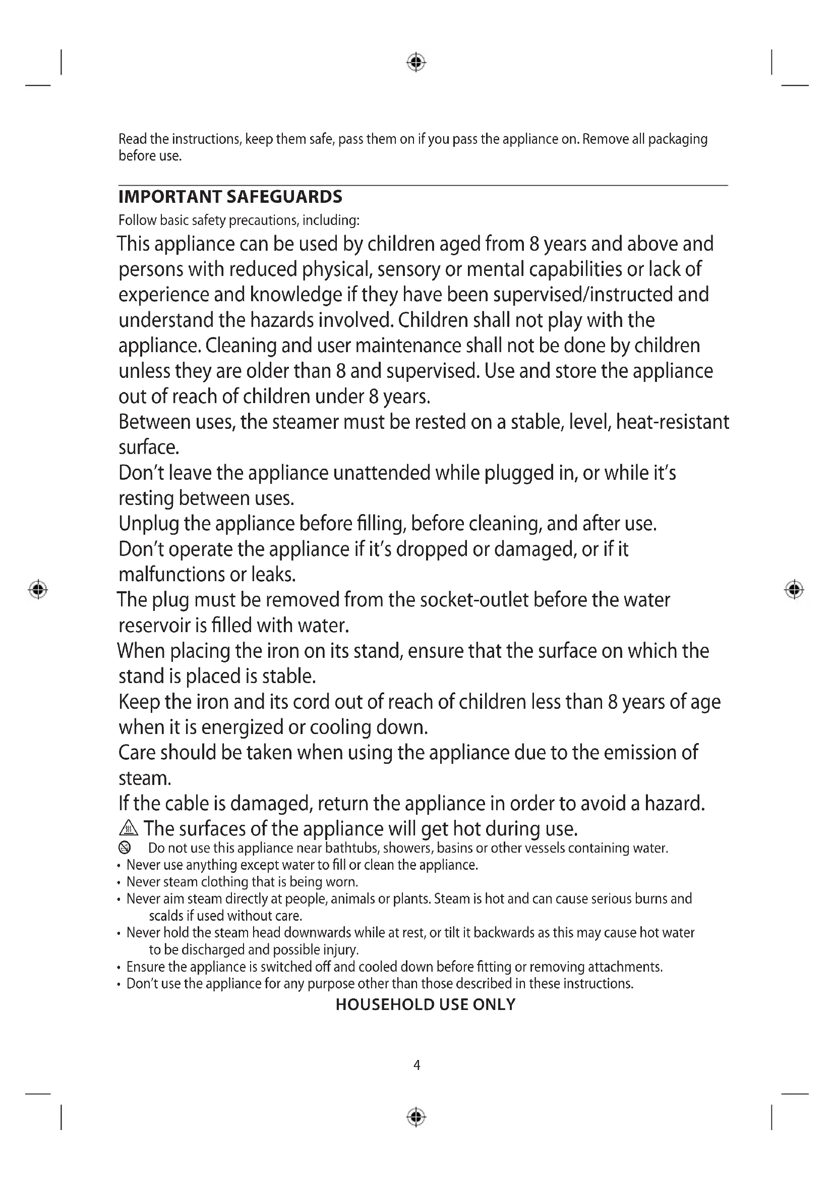 AE4 Read the instructions, keep them safe, pass them on if you pass the appliance on. Remove all packaging before use. IMPORTANT SAFEGUARDS Follow basic safety precautions, including: This appliance can be used by children aged from 8 years and above and persons with reduced physical, sensory or mental capabilities or lack of experience and knowledge if they have been supervised/instructed and understand the hazards involved. Children shall not play with the appliance. Cleaning and user maintenance shall not be done by children unless they are older than 8 and supervised. Use and store the appliance out of reach of children under 8 years. Between uses, the steamer must be rested on a stable, level, heat-resistant surface. Don’t leave the appliance unattended while plugged in, or while it’s resting between uses. Unplug the appliance before filling, before cleaning, and after use. Don’t operate the appliance if it’s dropped or damaged, or if it malfunctions or leaks. The plug must be removed from the socket-outlet before the water reservoir is filled with water. When placing the iron on its stand, ensure that the surface on which the stand is placed is stable. Keep the iron and its cord out of reach of children less than 8 years of age when it is energized or cooling down. Care should be taken when using the appliance due to the emission of steam. If the cable is damaged, return the appliance in order to avoid a hazard.