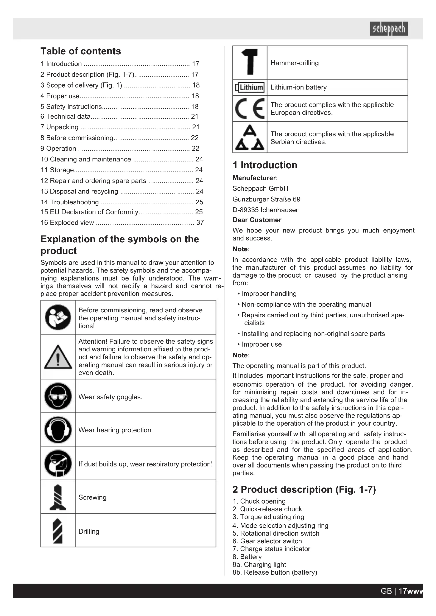- Improper use Note: The operating manual is part of this product. It includes important instructions for the safe, proper and economic operation of the product, for avoiding danger, for minimising repair costs and downtimes and for in- creasing the reliability and extending the service life of the product. In addition to the safety instructions in this oper- ating manual, you must also observe the regulations ap- plicable to the operation of the product in your country. Familiarise yourself with all operating and safety instruc- tions before using the product. Only operate the product as described and for the specified areas of application. Keep the operating manual in a good place and hand over all documents when passing the product on to third parties. 2 Product description (Fig. 1-7)